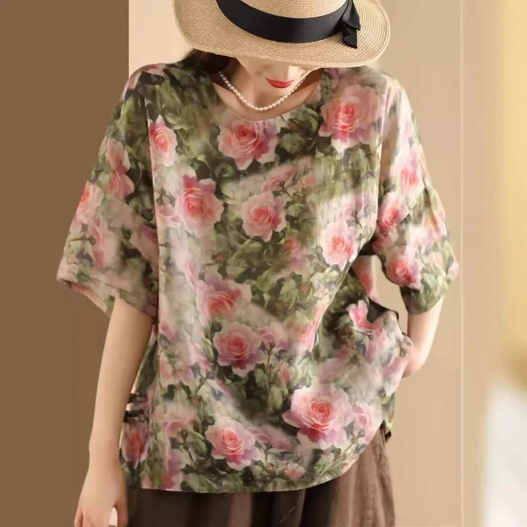 衣都精品- 新款文藝寬鬆印花盤扣短袖上衣