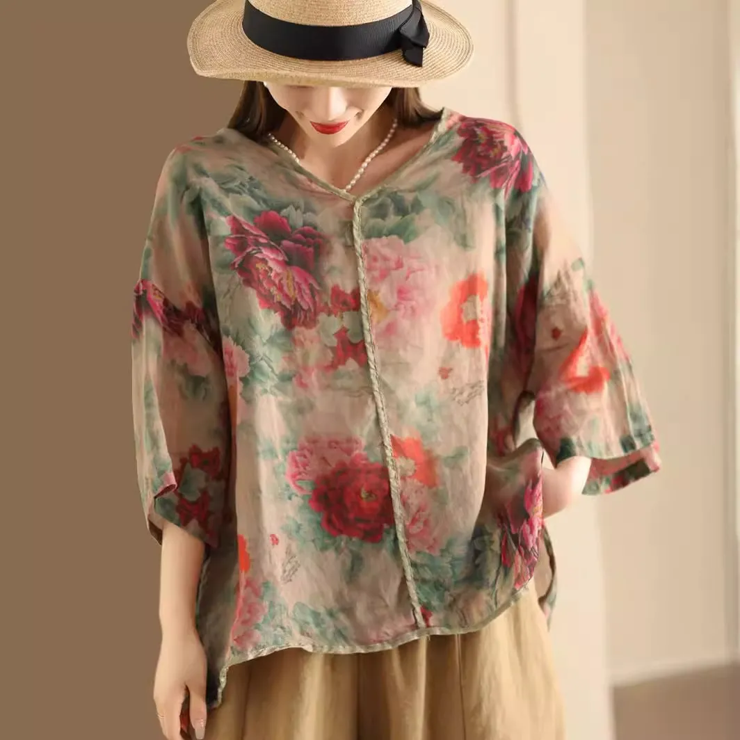 衣都精品- 新款文藝寬鬆印花盤扣短袖上衣