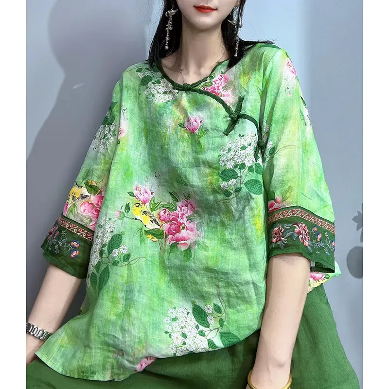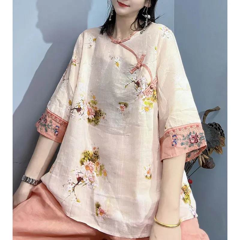 衣都精品- 新款五分袖V領斜襟盤扣印花刺繡上衣