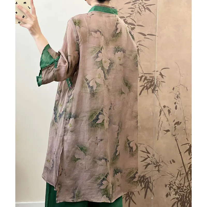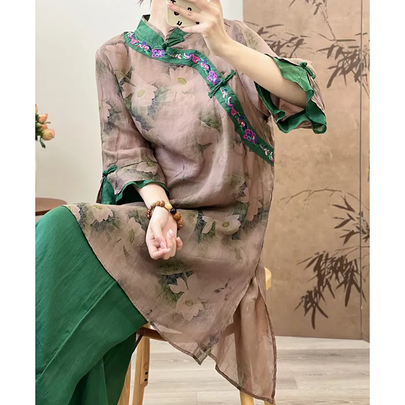衣都精品- 新款五分袖V領斜襟盤扣印花刺繡上衣