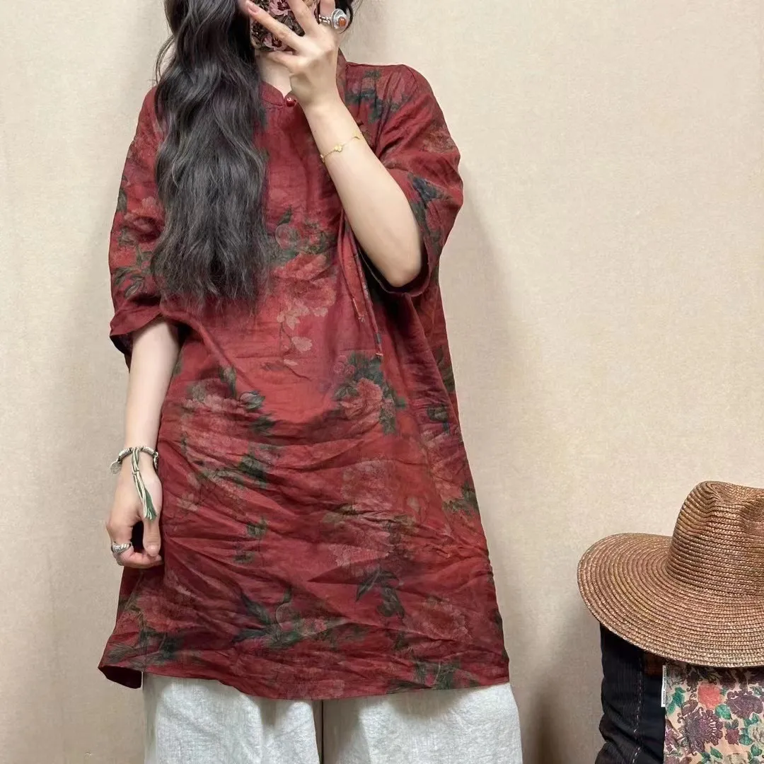 衣都精品- 新款五分袖V領斜襟盤扣印花刺繡上衣