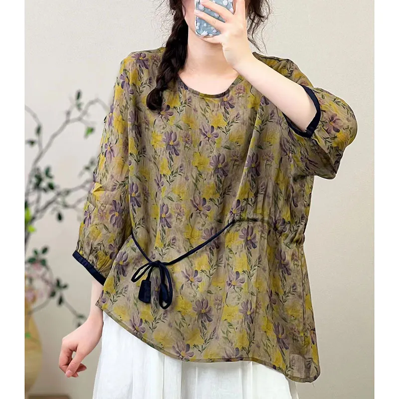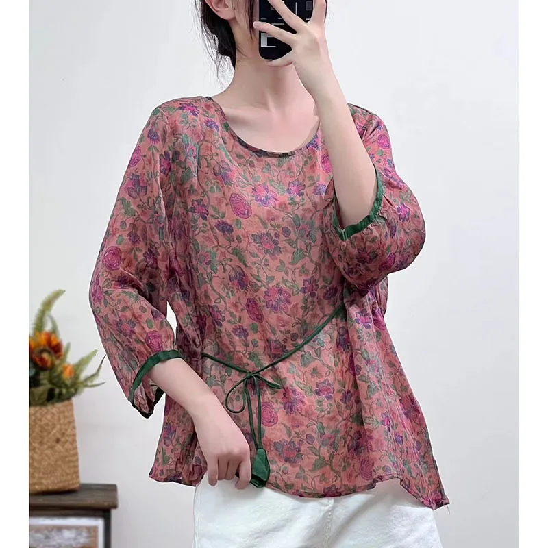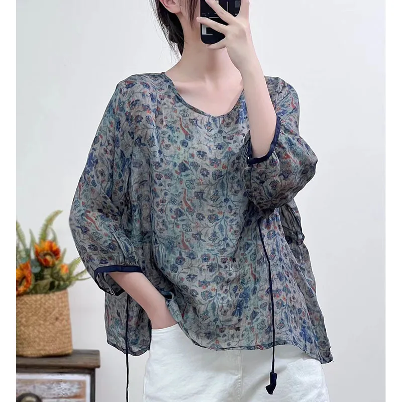 衣都精品- 新款民族風復古高端印花刺繡小V領上衣