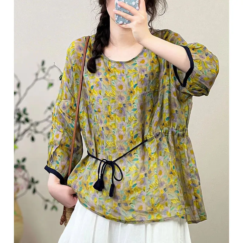 衣都精品- 新款圓領套頭拼接繫帶收腰顯瘦上衣