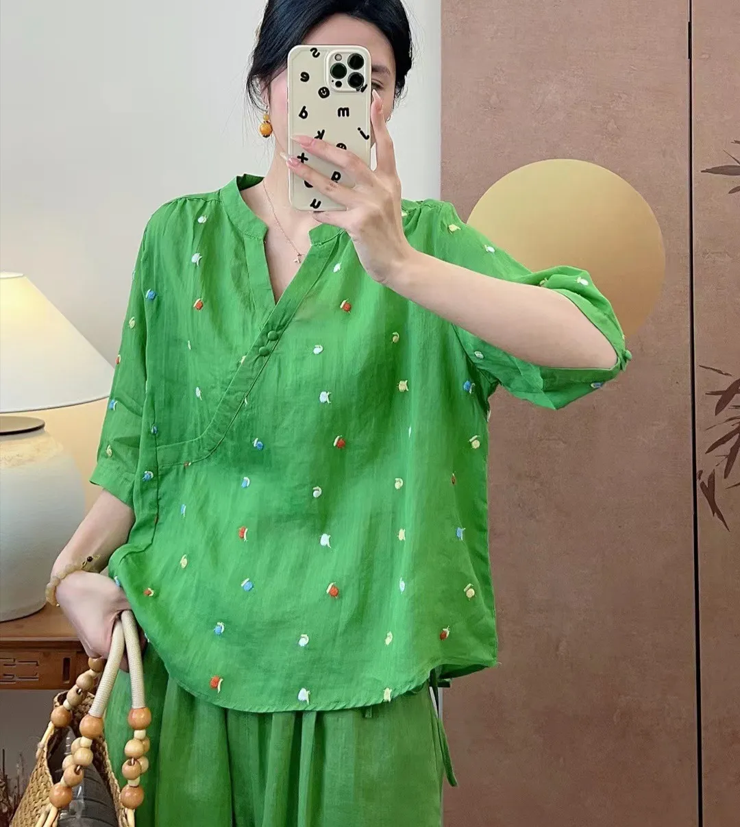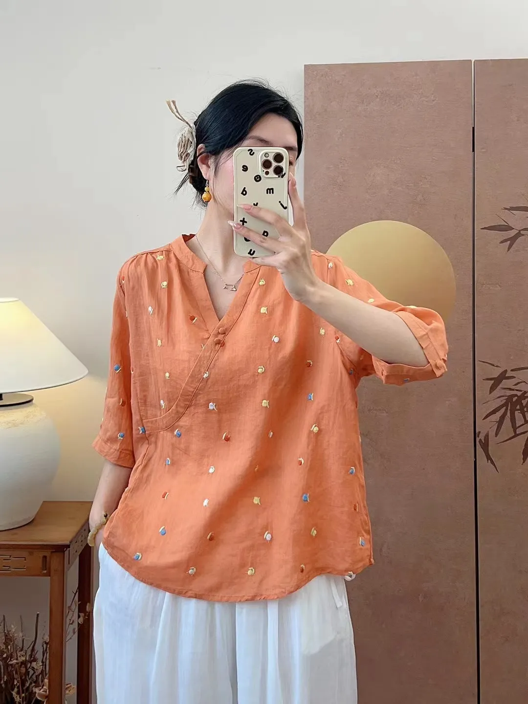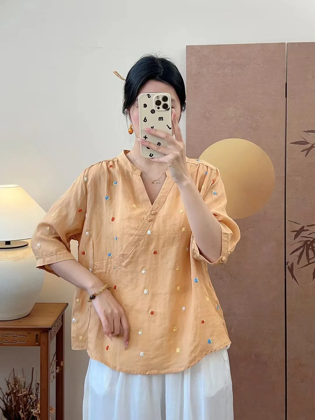 衣都精品- 新款文藝氣質套頭刺繡V領中袖上衣