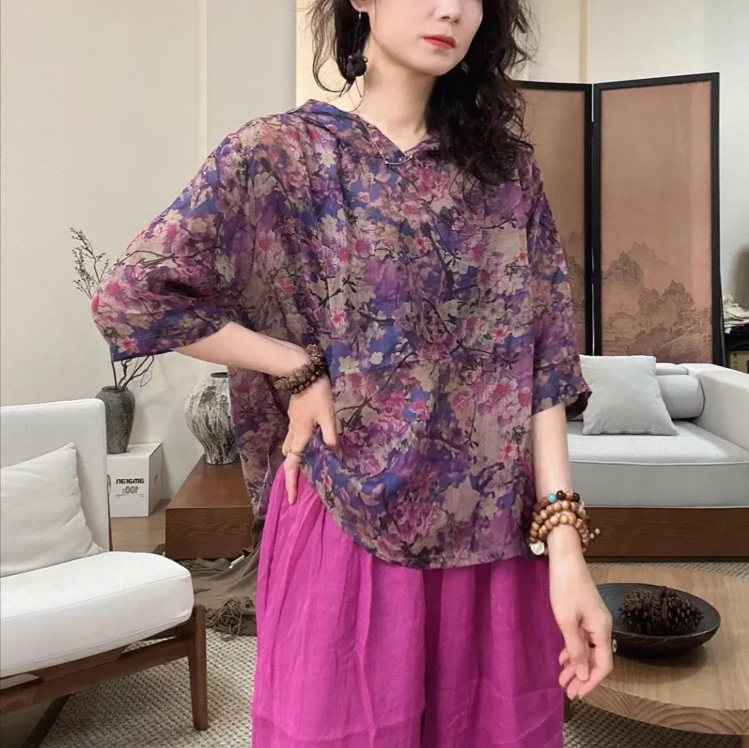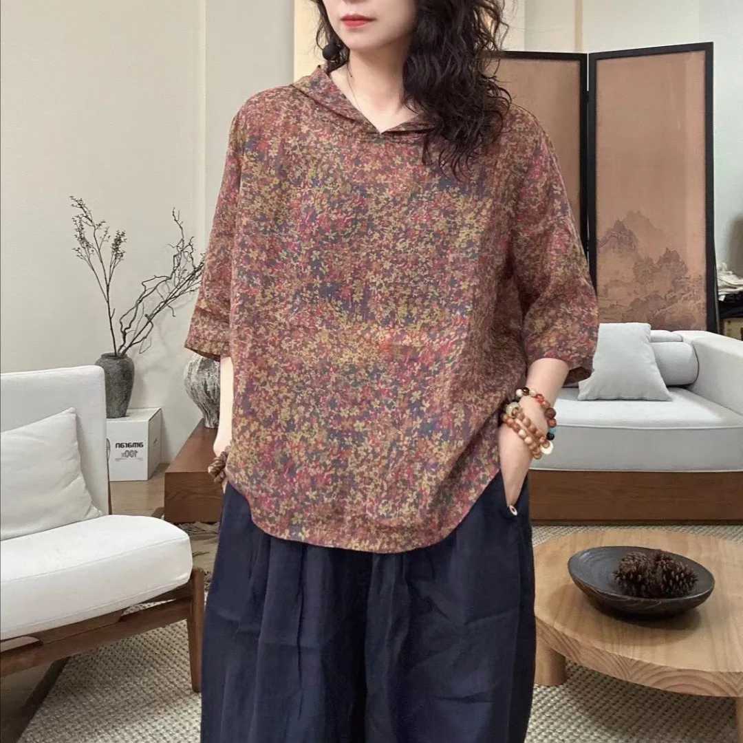 衣都精品- 新款寬鬆大碼薄款印花連帽中袖套頭上衣