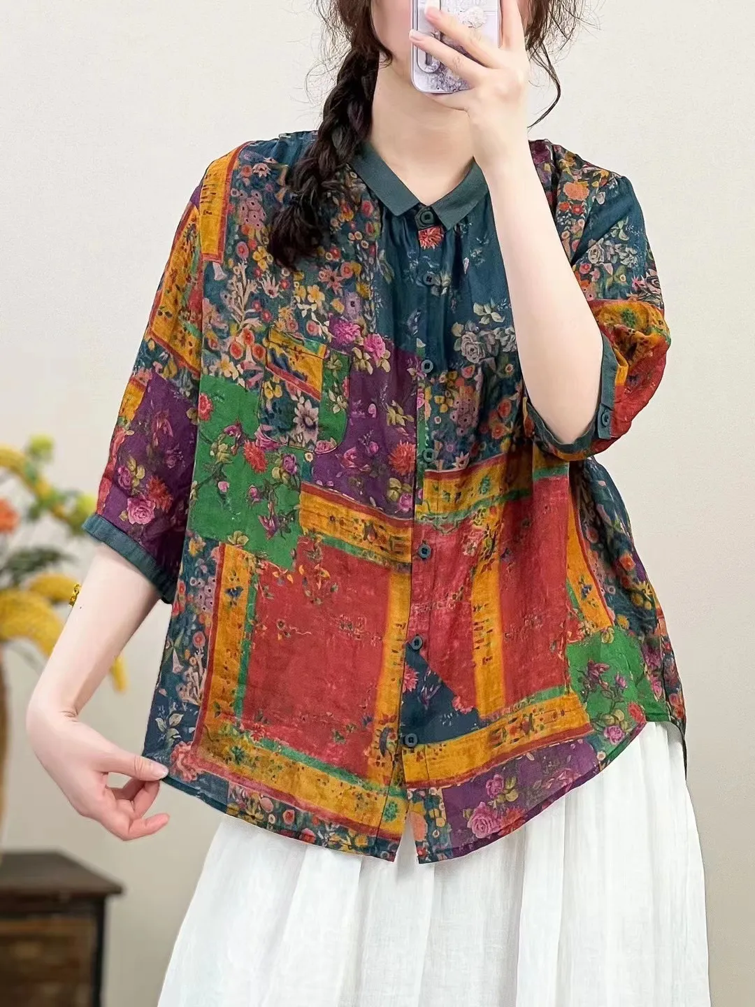 衣都精品- 新款寬鬆大碼薄款文藝復古碎花上衣