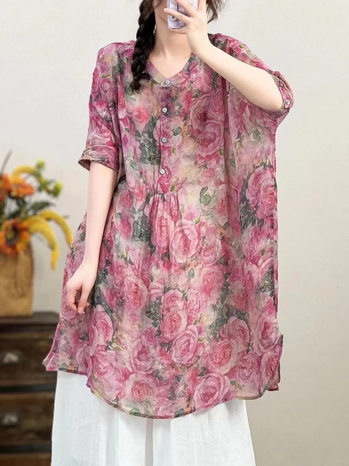 衣都精品- 新款復古炒色印花薄款翻領中袖上衣