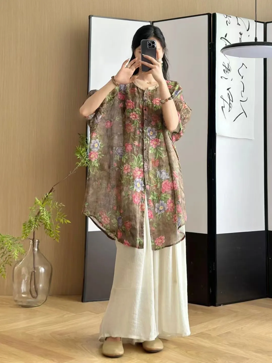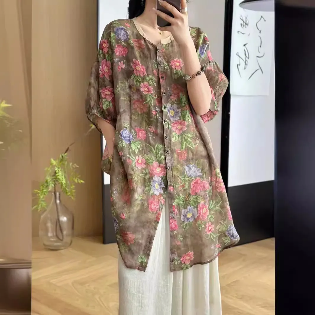 衣都精品- 新款復古印花文藝中長款禪意七分袖上衣