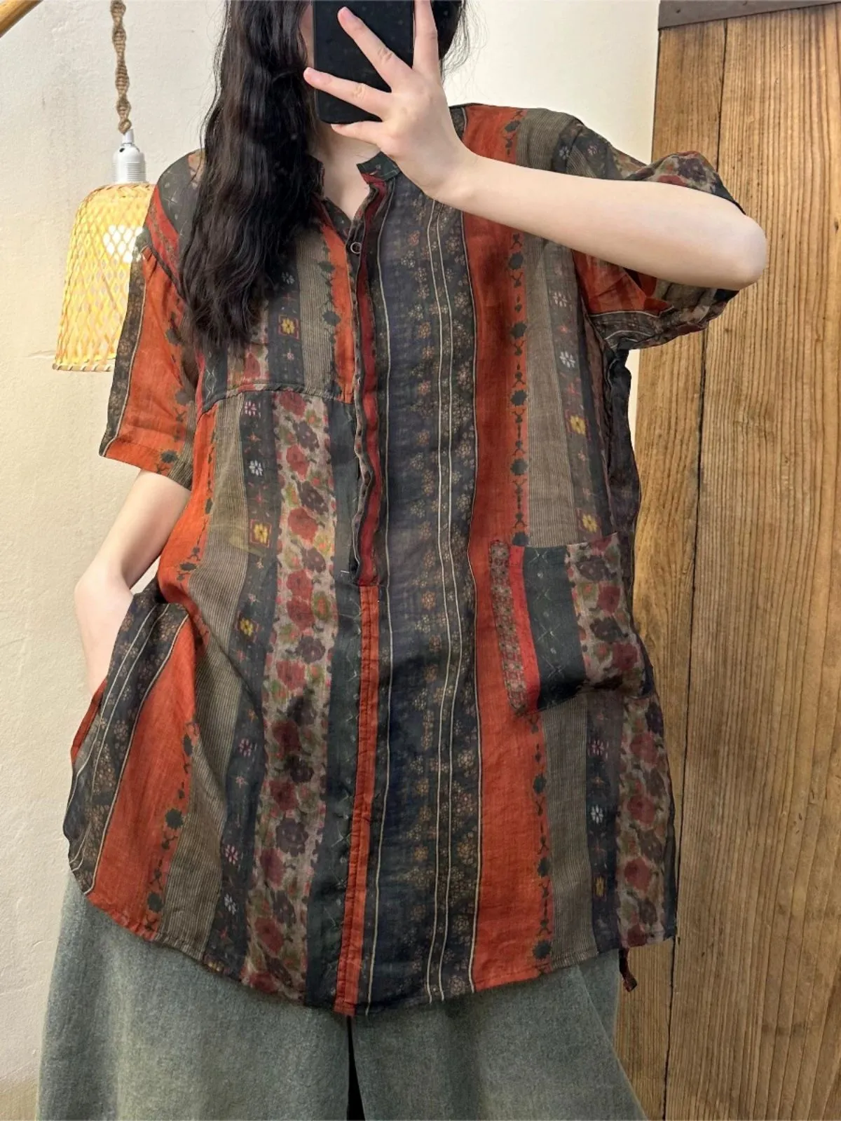 衣都精品- 新款復古炒色印花薄款翻領中袖上衣