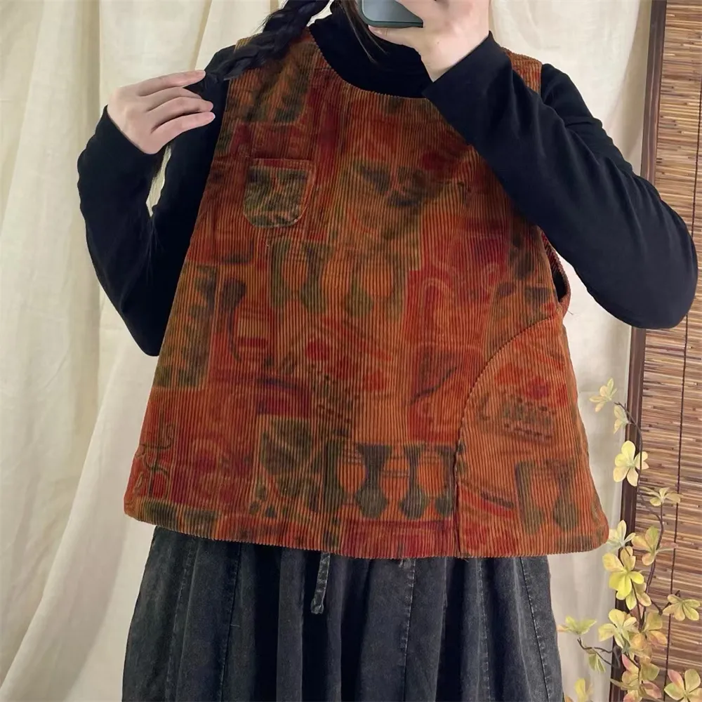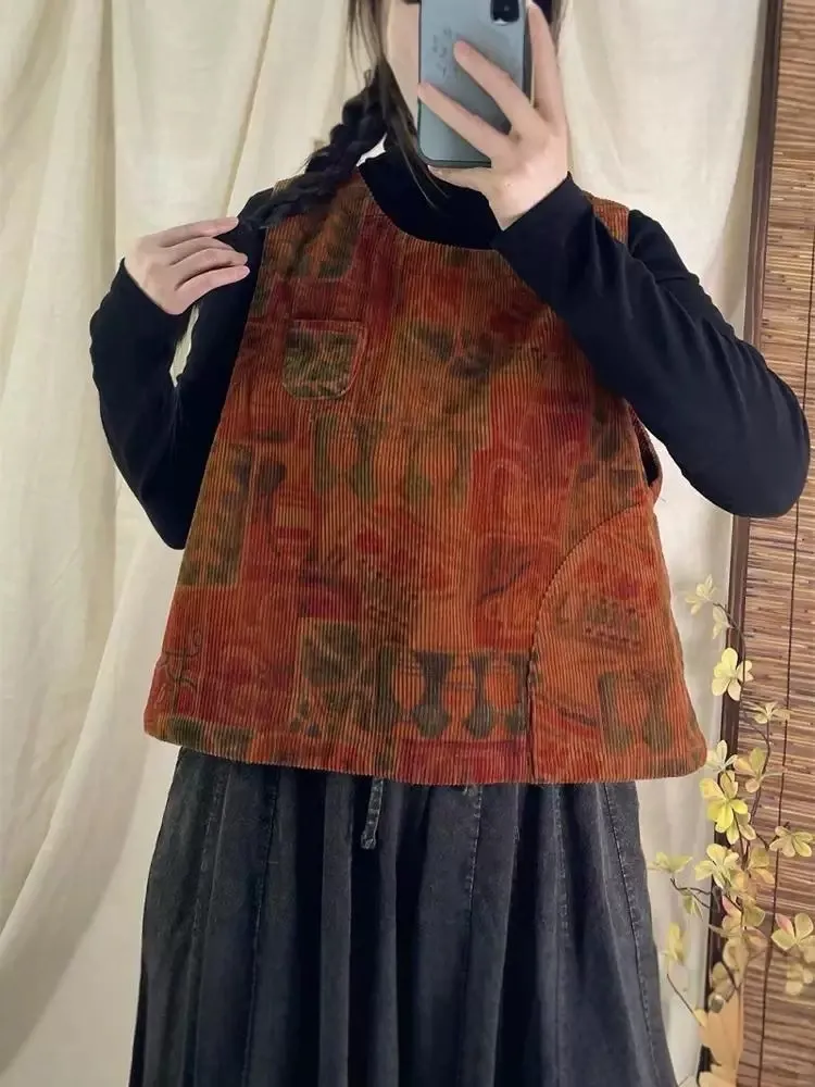 衣都精品- 新款復古燈芯絨印花圓領無袖馬甲外套