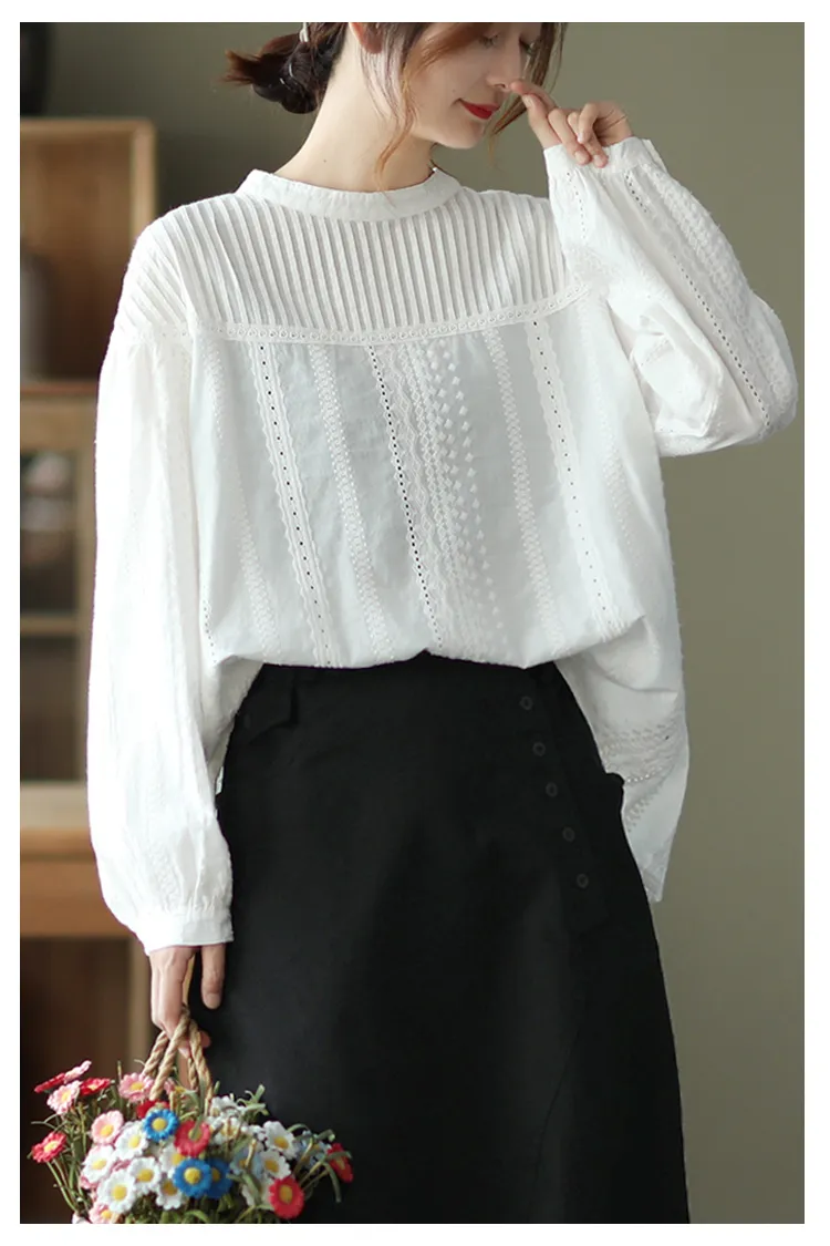 衣都精品- 新款文藝風琴褶甜美蕾絲鏤空長袖上衣