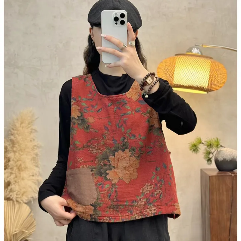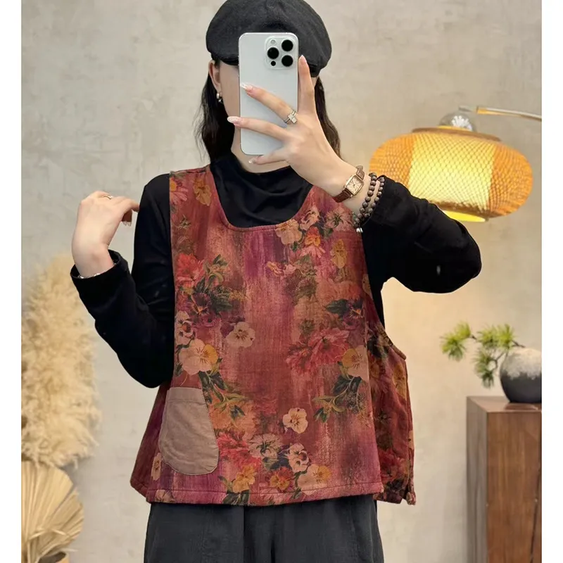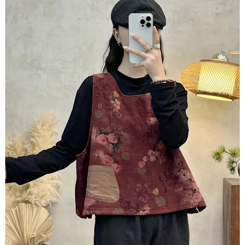 衣都精品- 新款復古燈芯絨印花圓領無袖馬甲外套