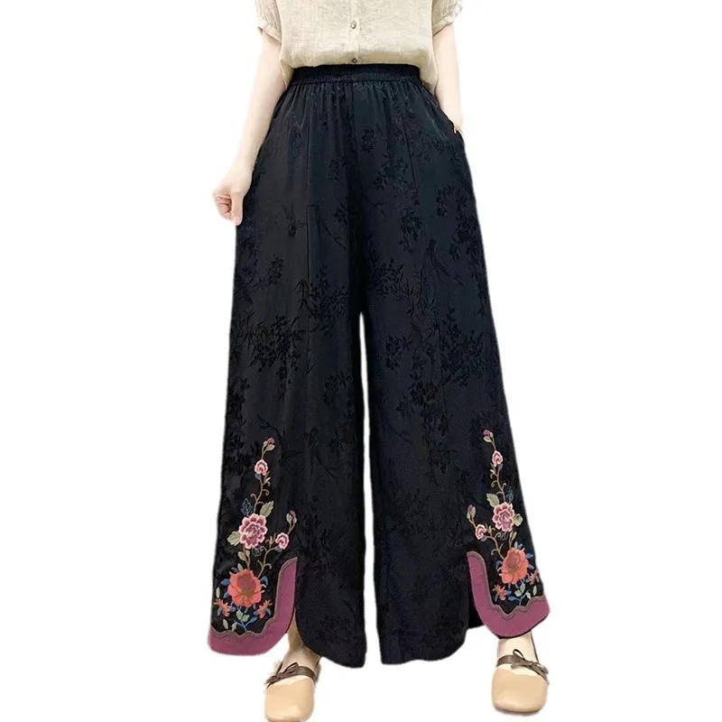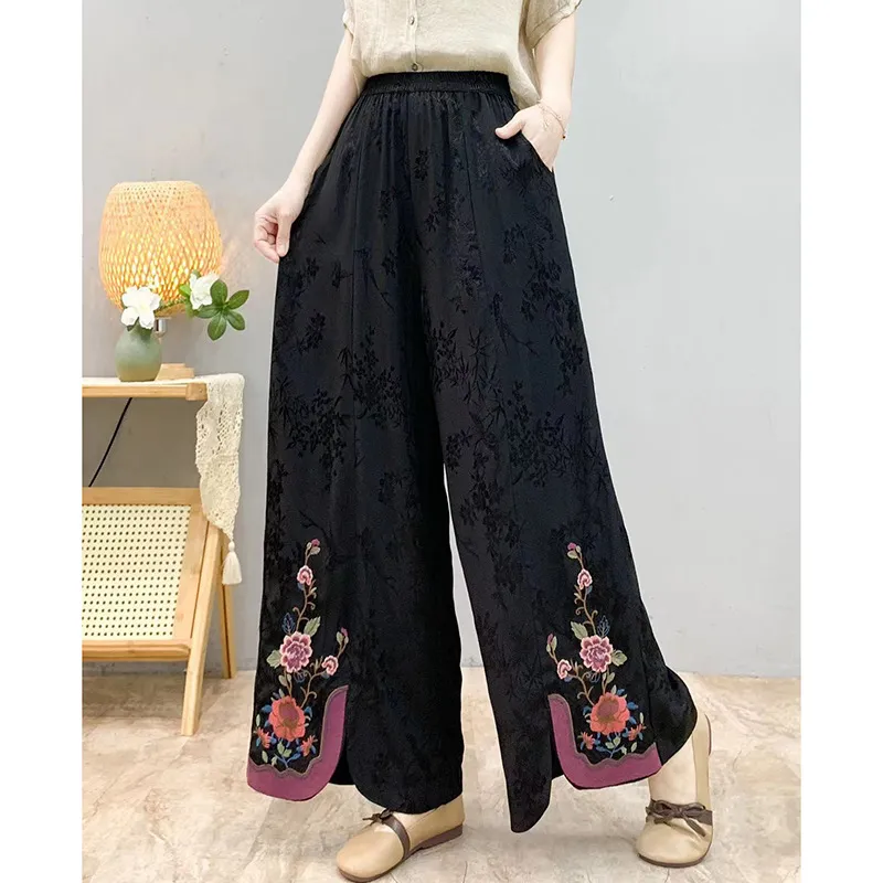 衣都精品- 新款民族風刺繡緞面提花鬆緊腰大碼顯瘦闊腿褲