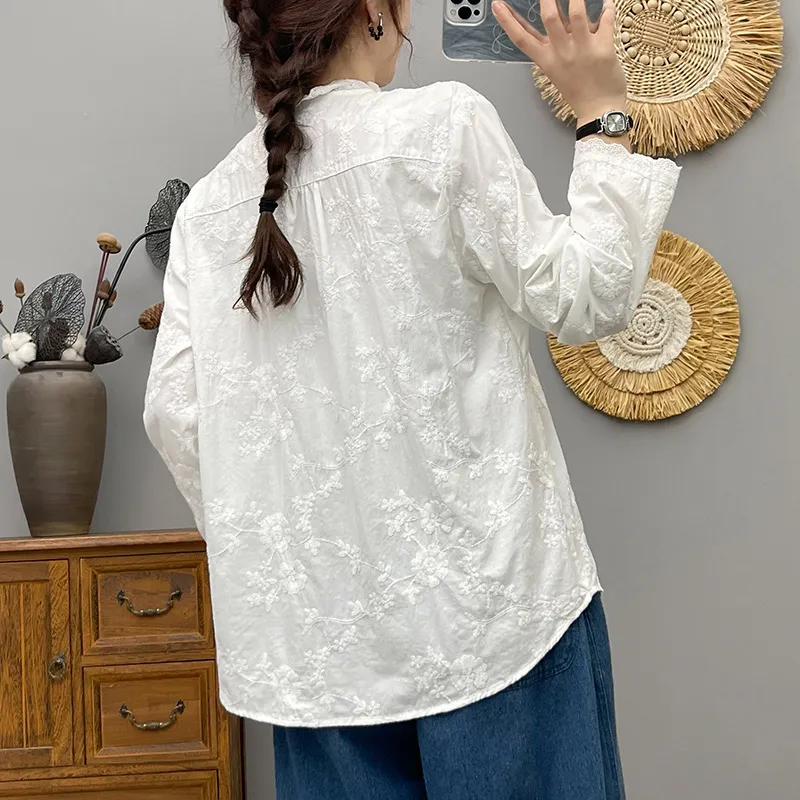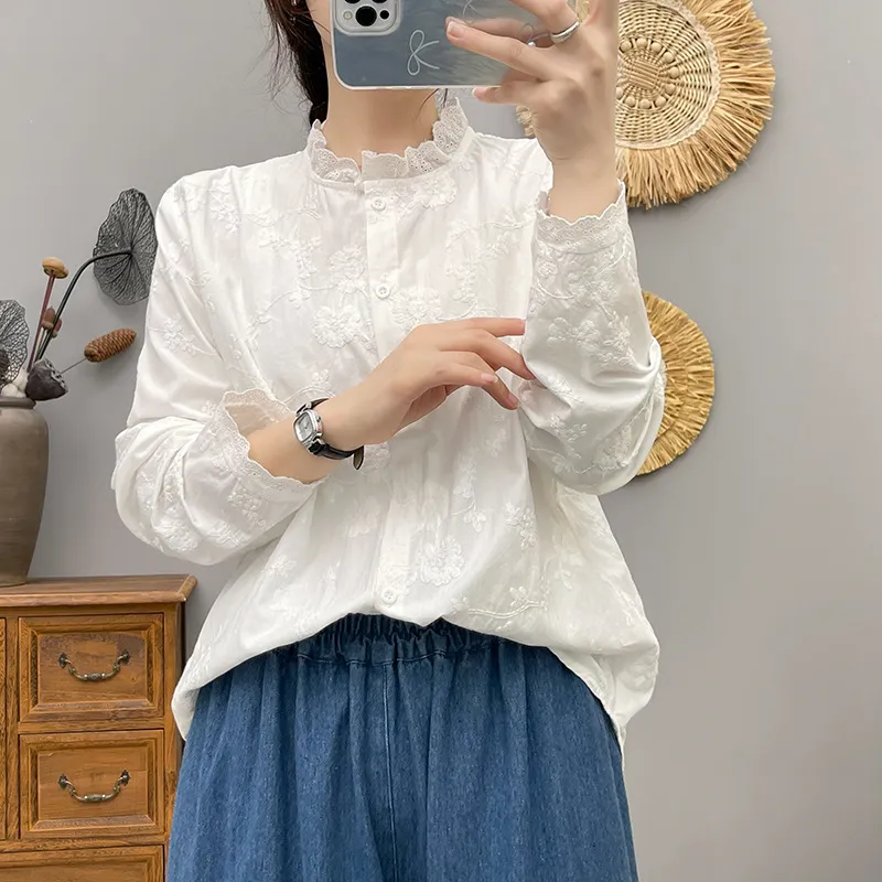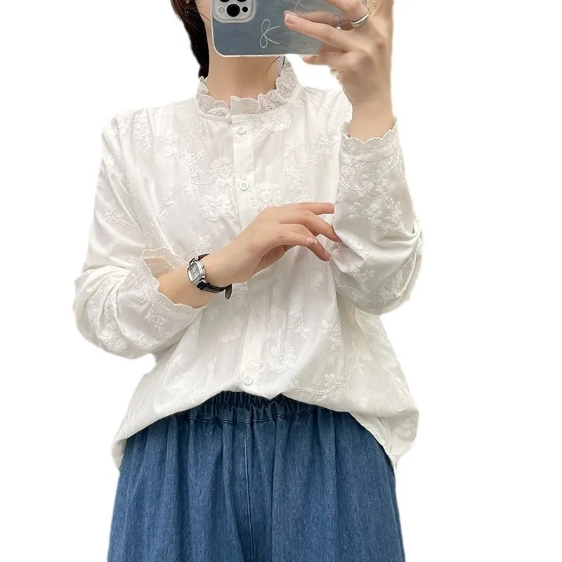 衣都精品- 新款重工立領花邊刺繡拼接蕾絲上衣