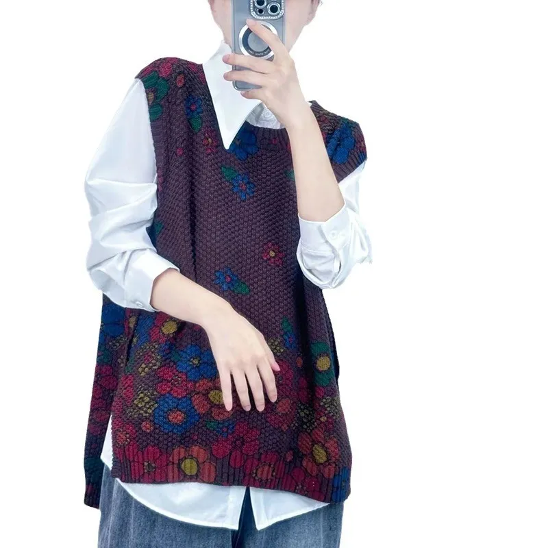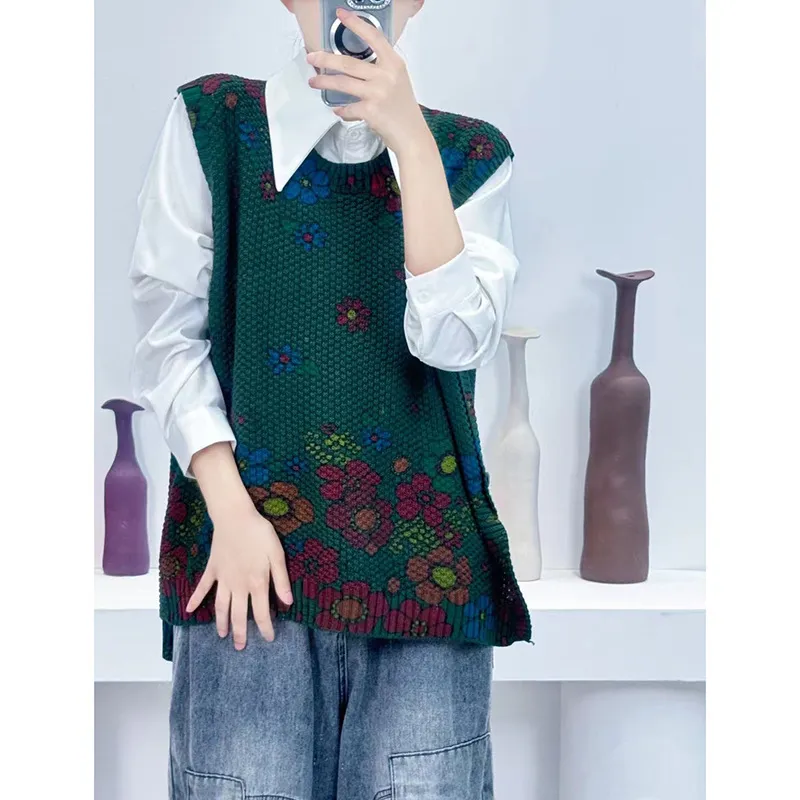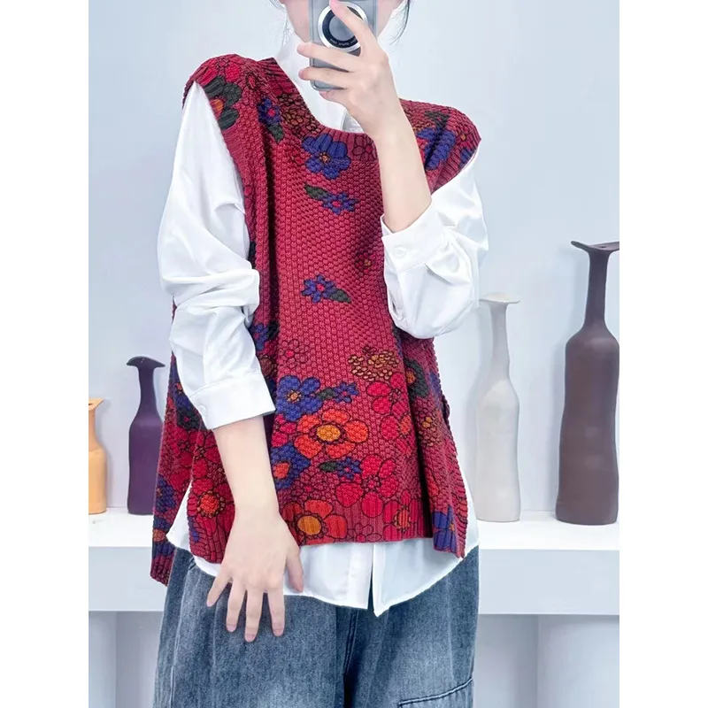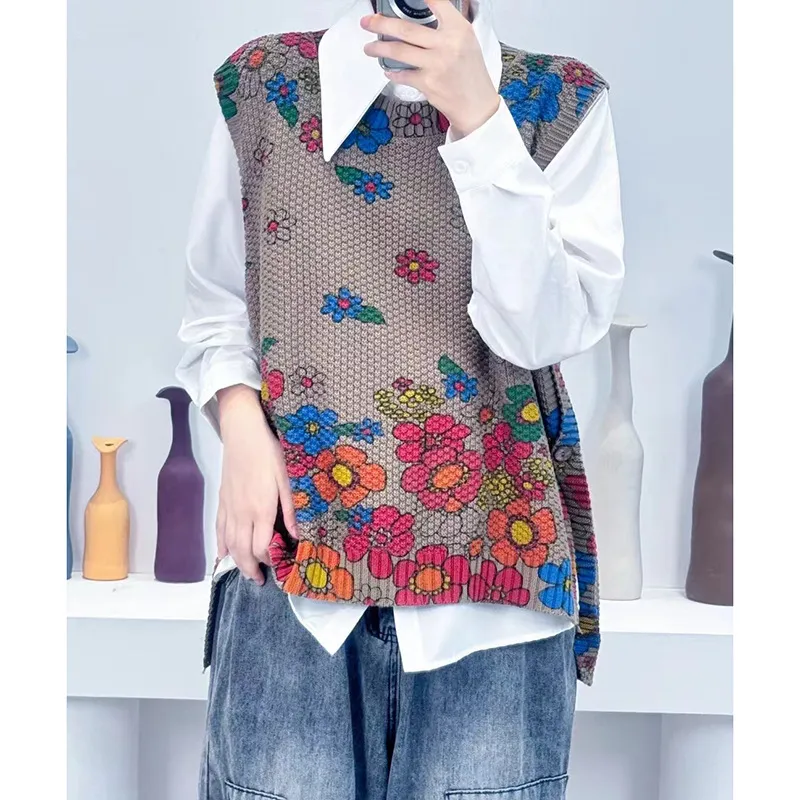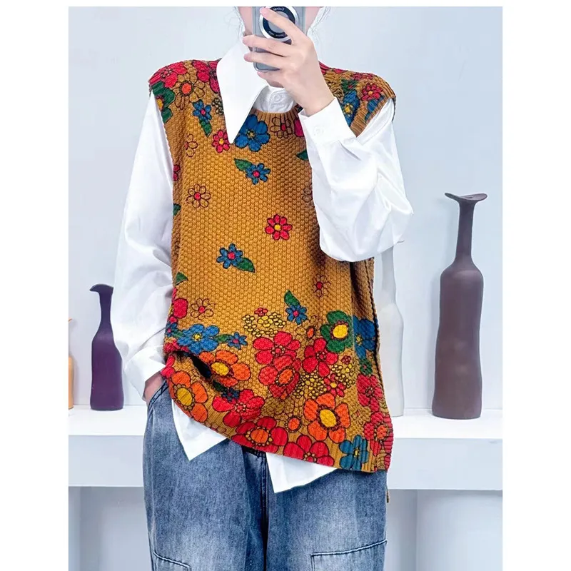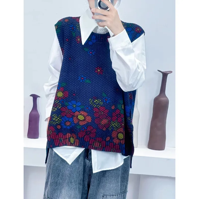 衣都精品- 新款復古文藝針織印花前短後長馬甲上衣
