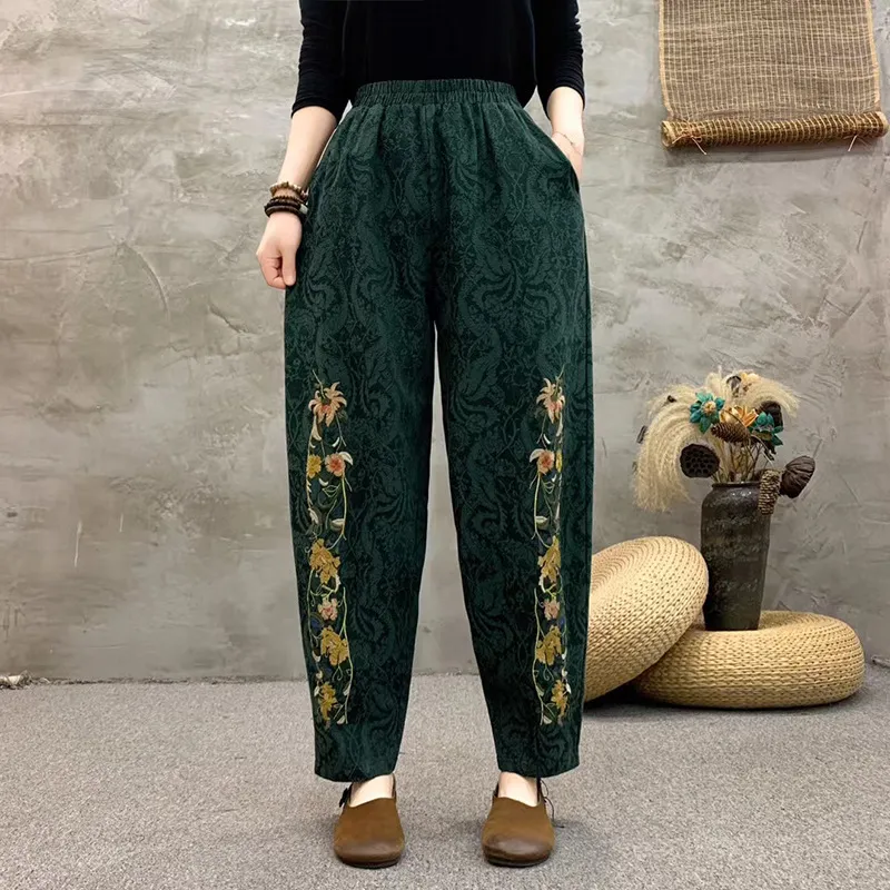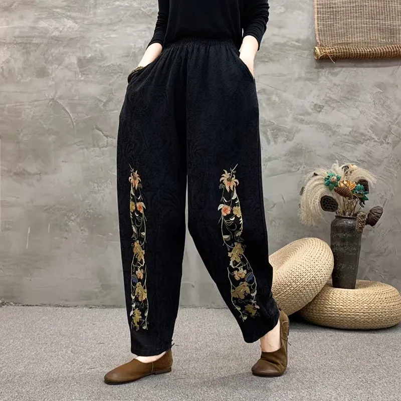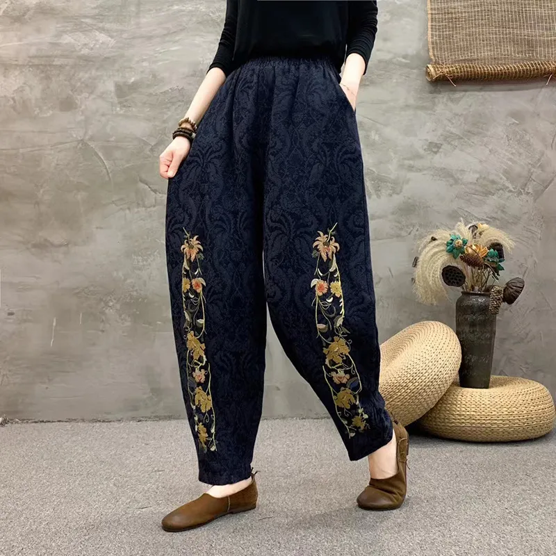 衣都精品- 新款民族風刺繡提花鬆緊腰大碼顯瘦哈倫褲