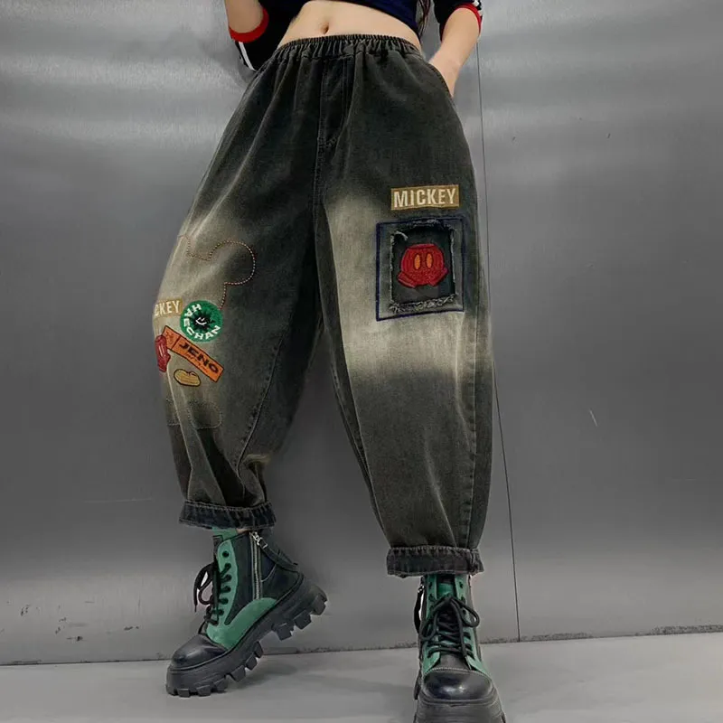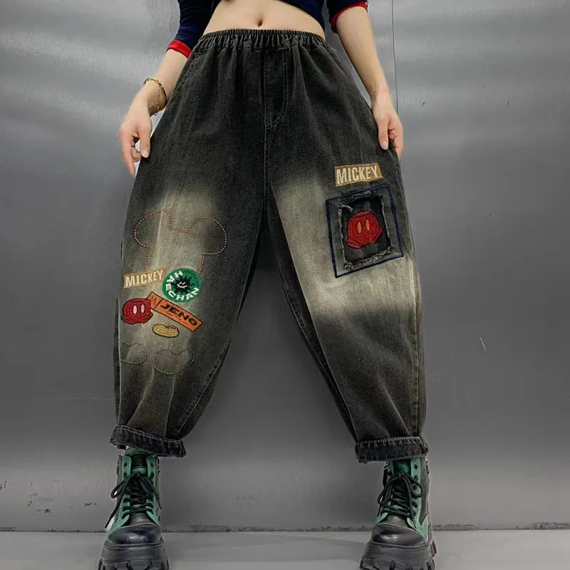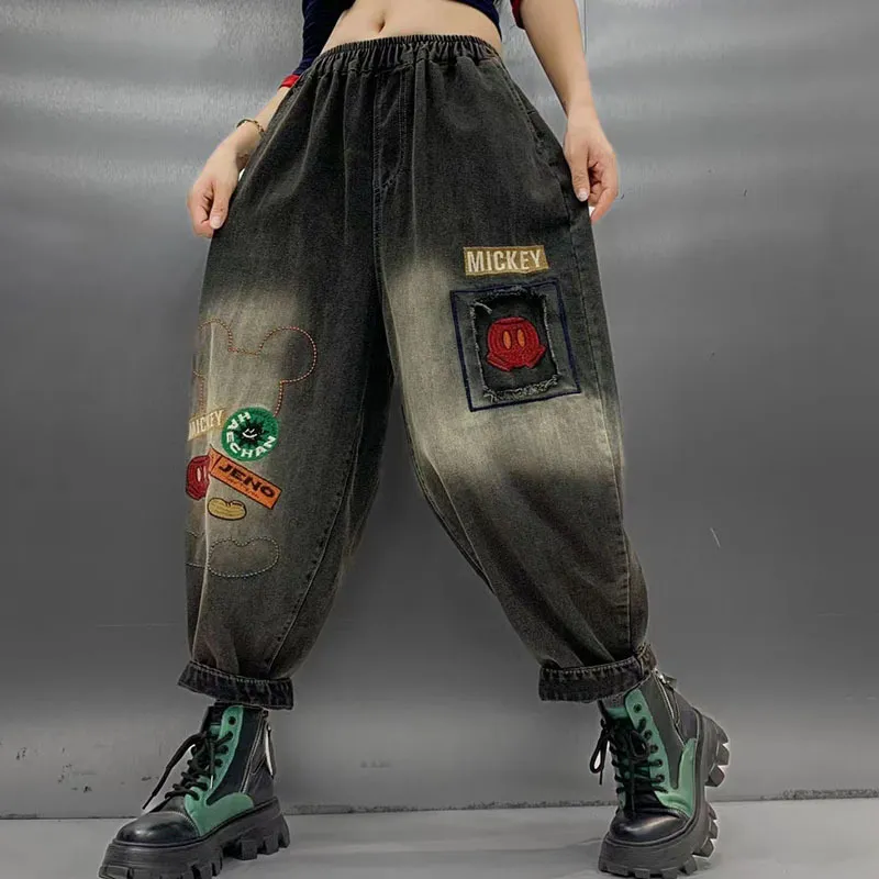 衣都精品- 新款貼布刺繡唐老鴨寬鬆顯瘦哈倫褲