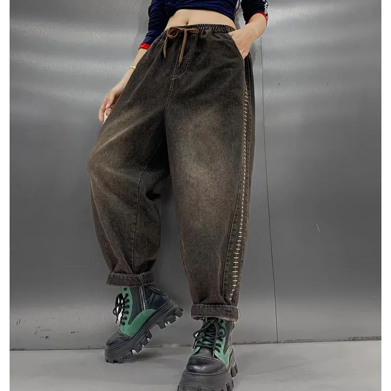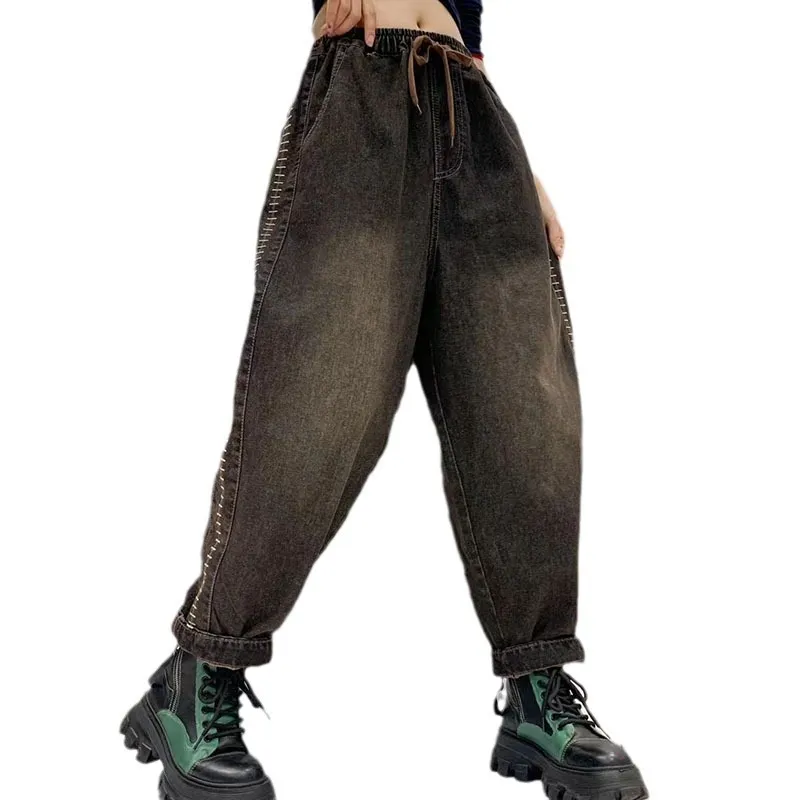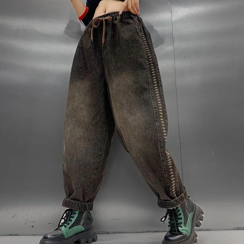 衣都精品- 新款貼布水洗磨白鬆緊腰寬鬆顯瘦哈倫褲