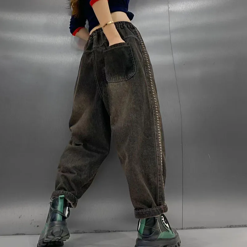 衣都精品- 新款水洗磨白米奇刺繡寬鬆顯瘦哈倫褲