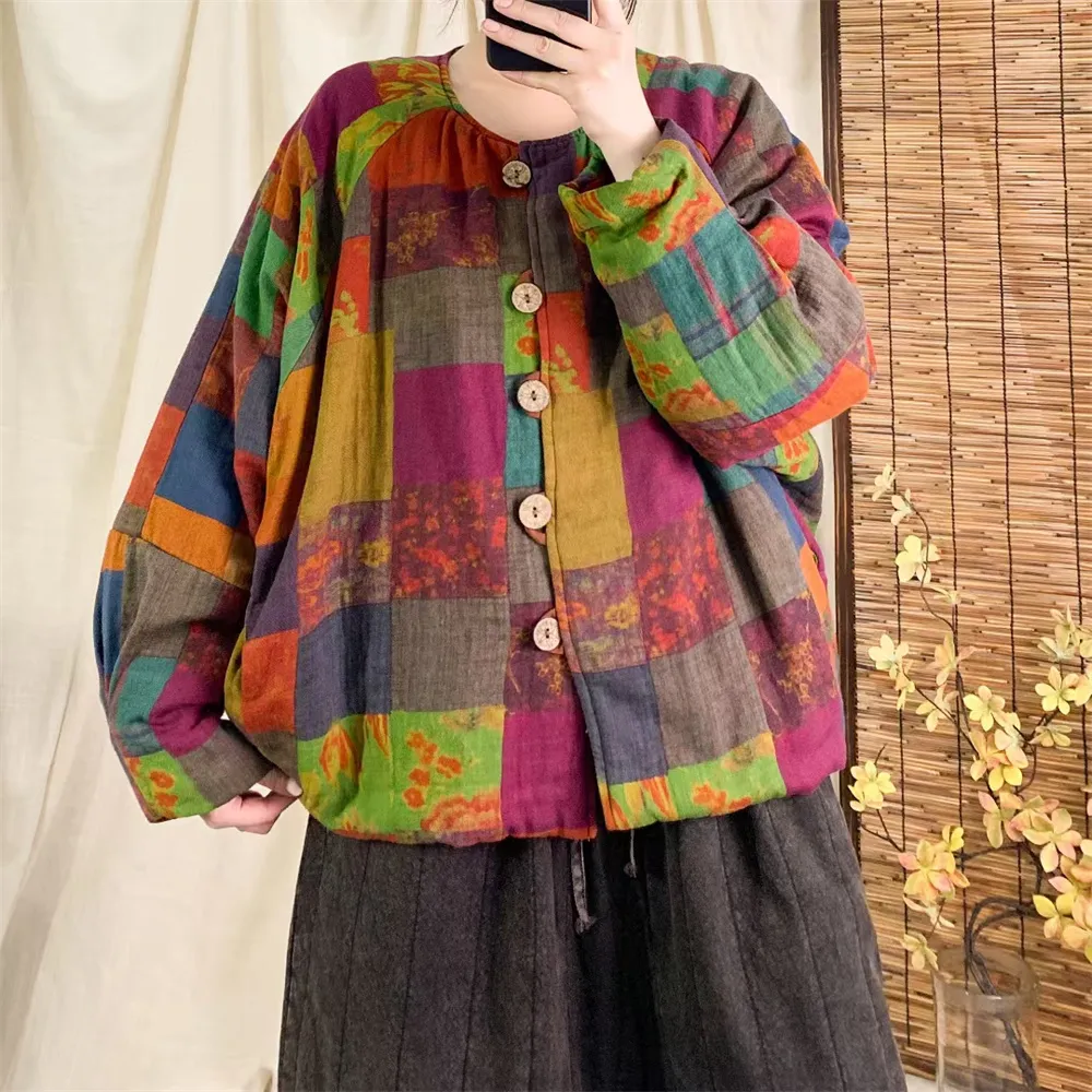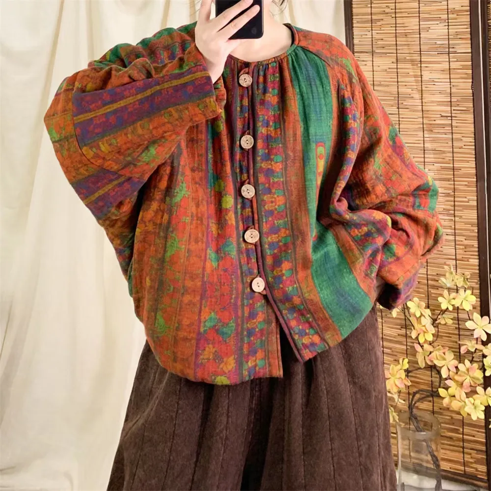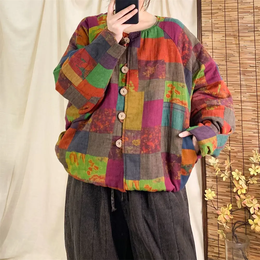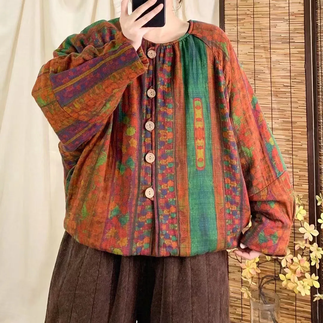 衣都精品- 新款復古棉麻印花圓領長袖棉服外套