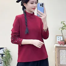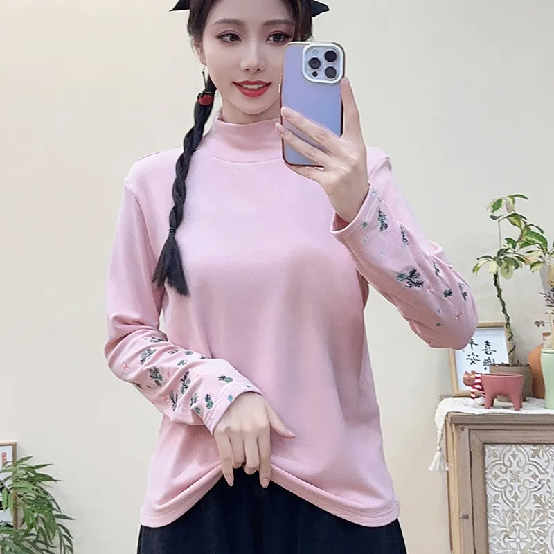 衣都精品- 新款長袖彈力刺繡純色高領上衣