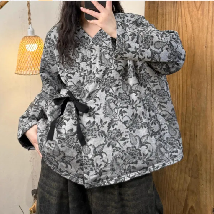 衣都精品- 新款復古棉麻印花圓領長袖棉服外套