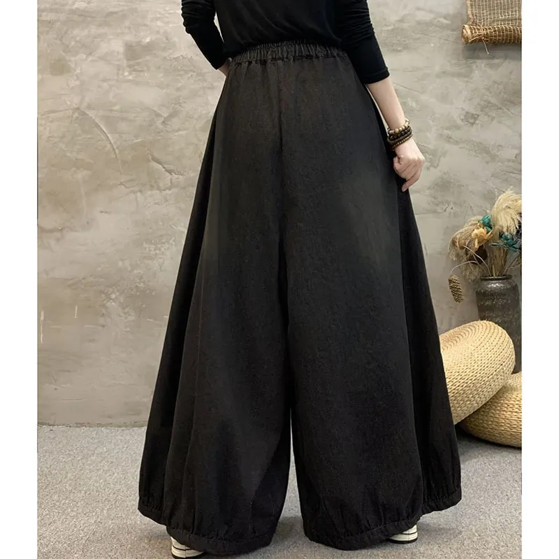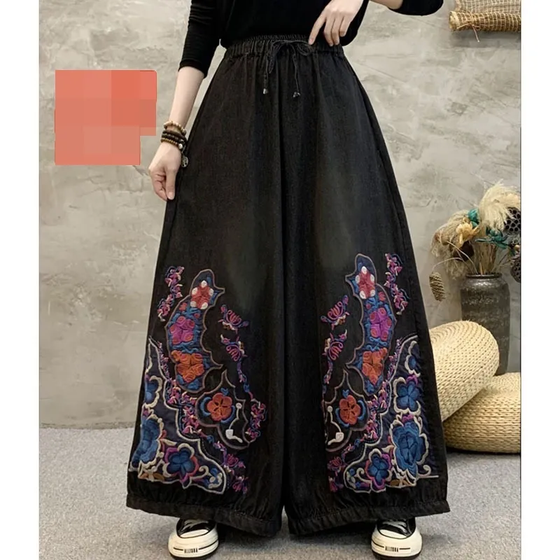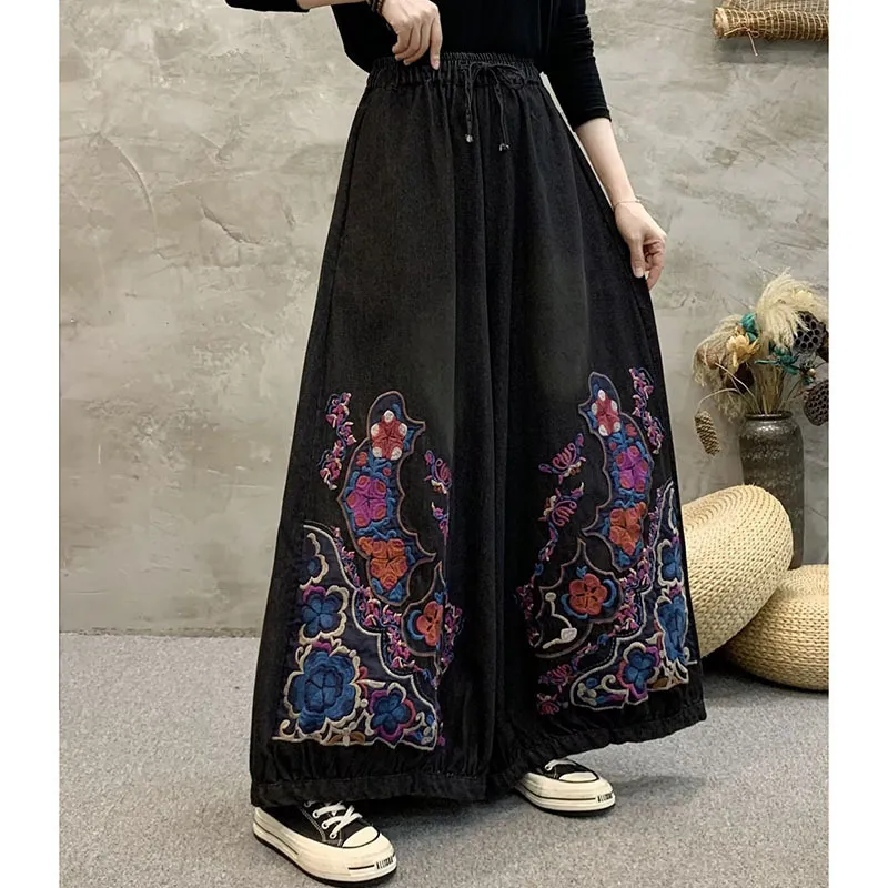 衣都精品- 新款民族風刺繡牛仔繫帶寬鬆大擺闊腿褲