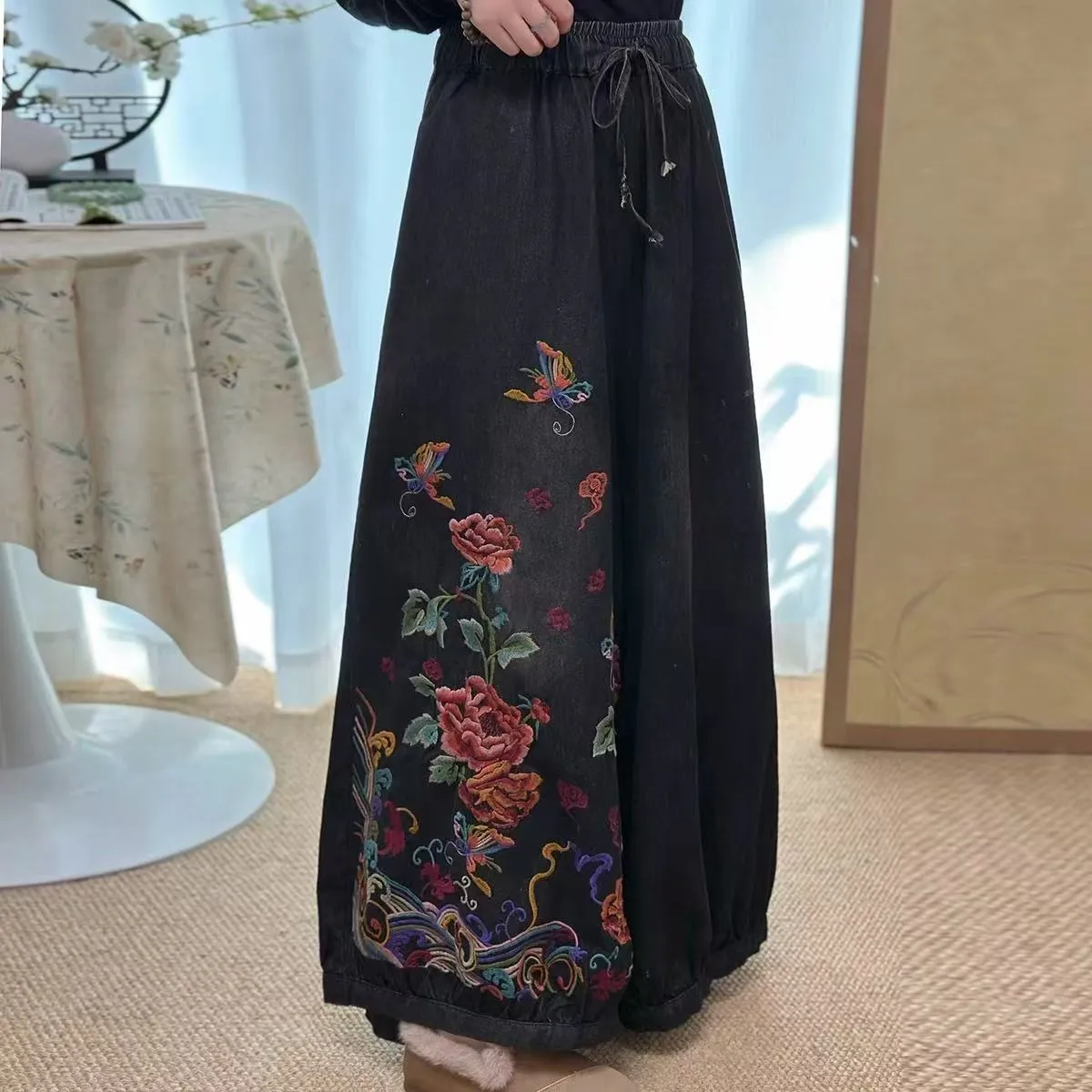 衣都精品- 新款牡丹刺繡高腰牛仔褲