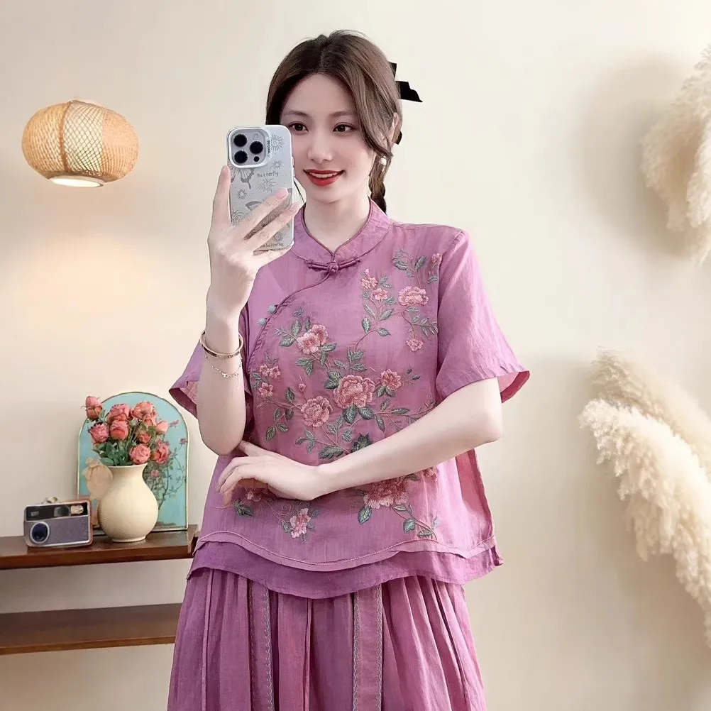 衣都精品- 新款刺繡立領復古盤扣潮流下擺上衣