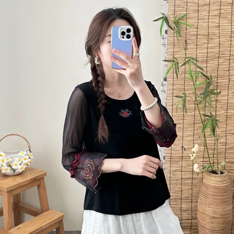 衣都精品- 新款刺繡立領復古盤扣潮流下擺上衣