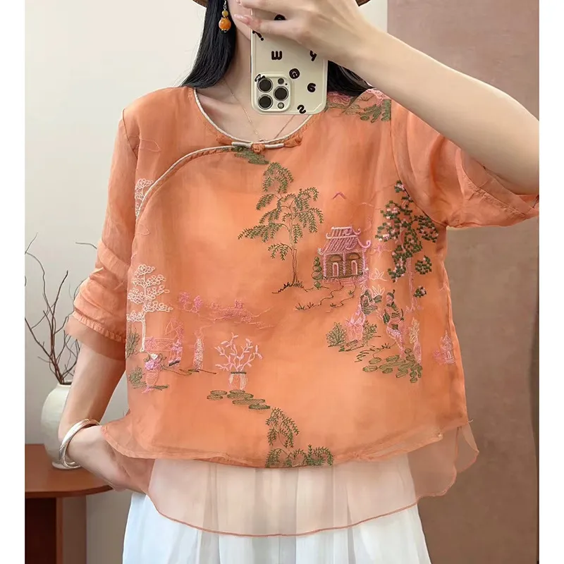 衣都精品- 新款刺繡立領復古盤扣潮流下擺上衣
