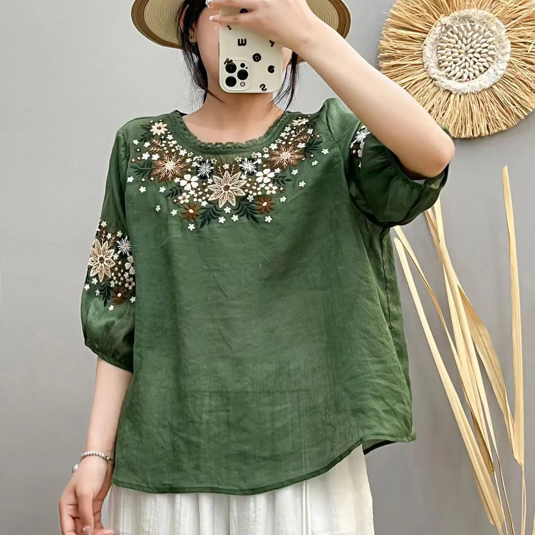 衣都精品- 新款重工刺繡圓領套頭寬鬆七分袖上衣