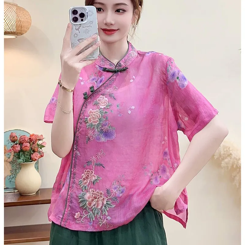衣都精品- 新款文藝休閒斜襟盤扣立領上衣