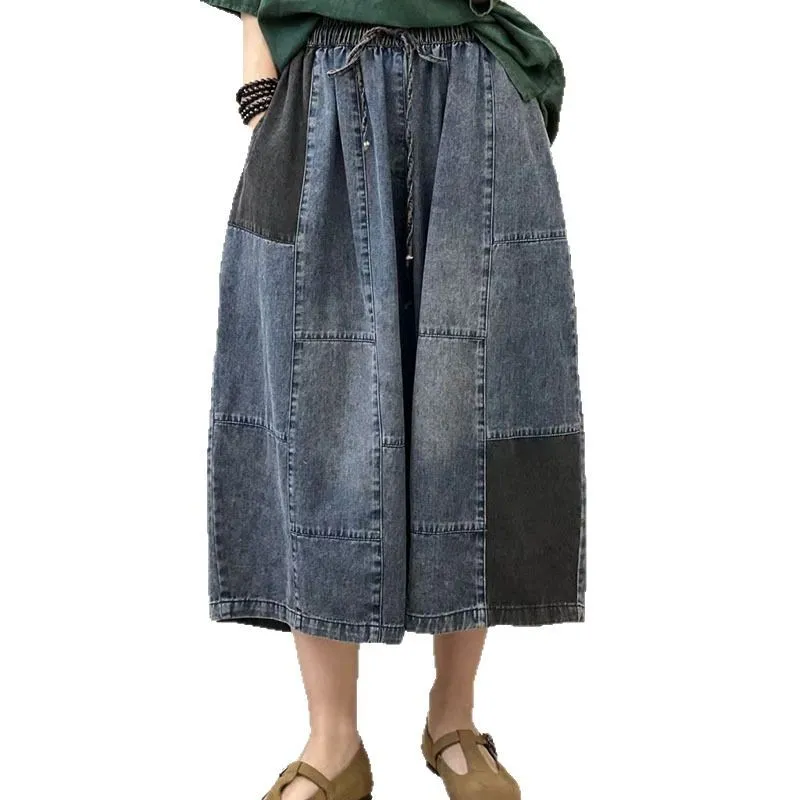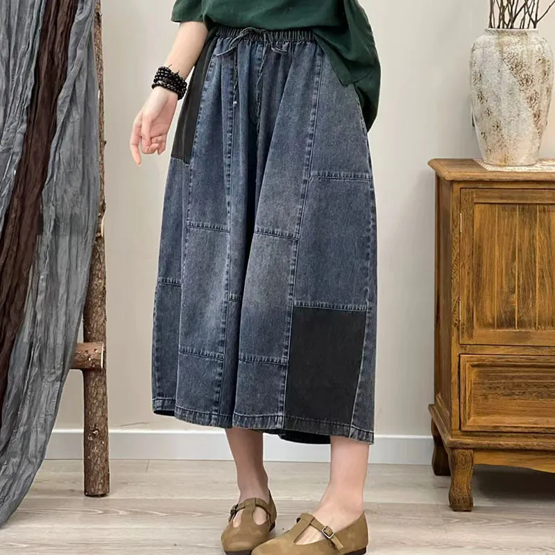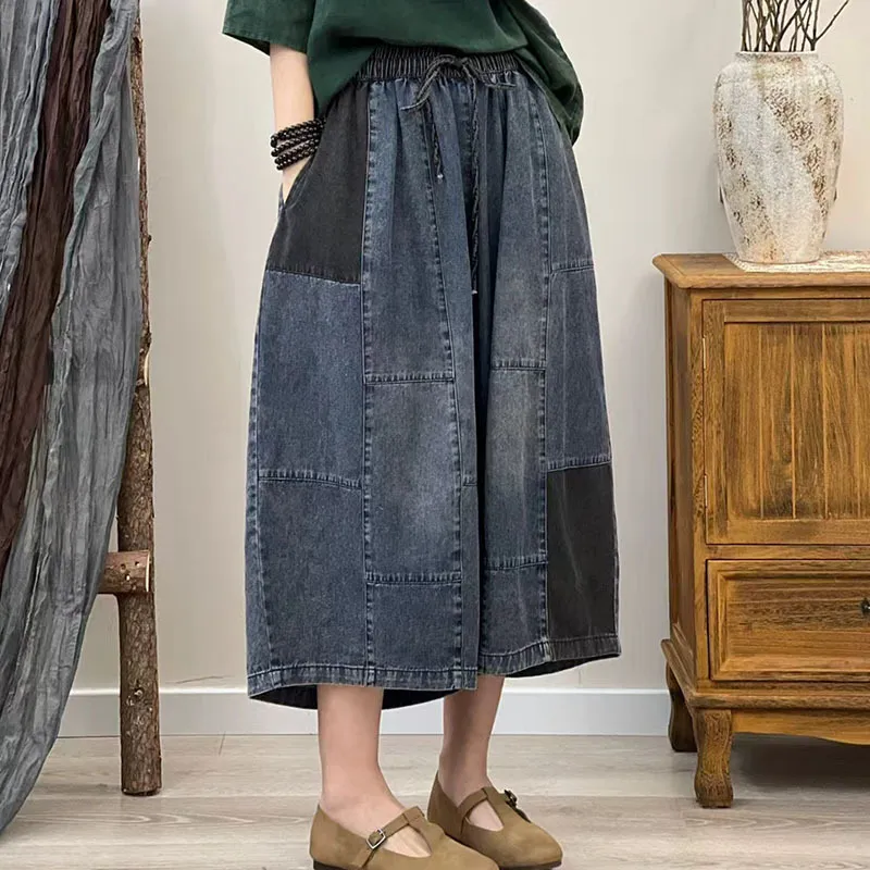 衣都精品- 新款鬆緊腰繫帶寬鬆休閒拼色七分牛仔褲
