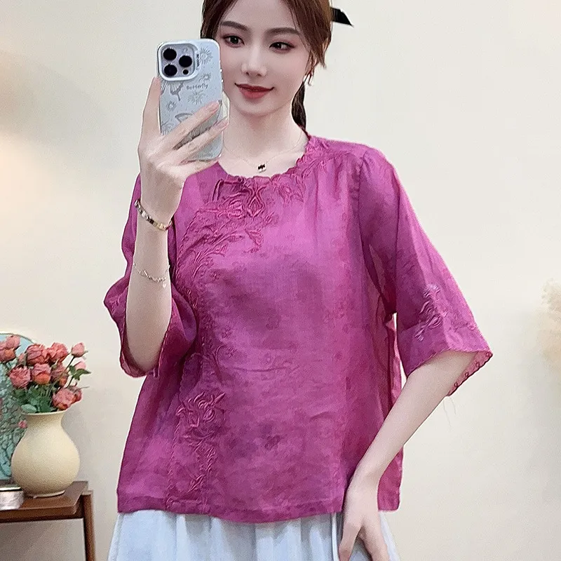 衣都精品- 新款重工刺繡圓領套頭寬鬆七分袖上衣