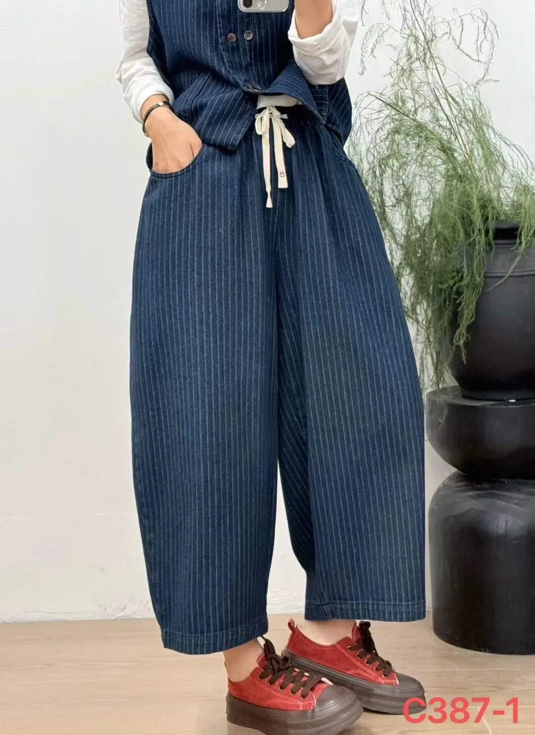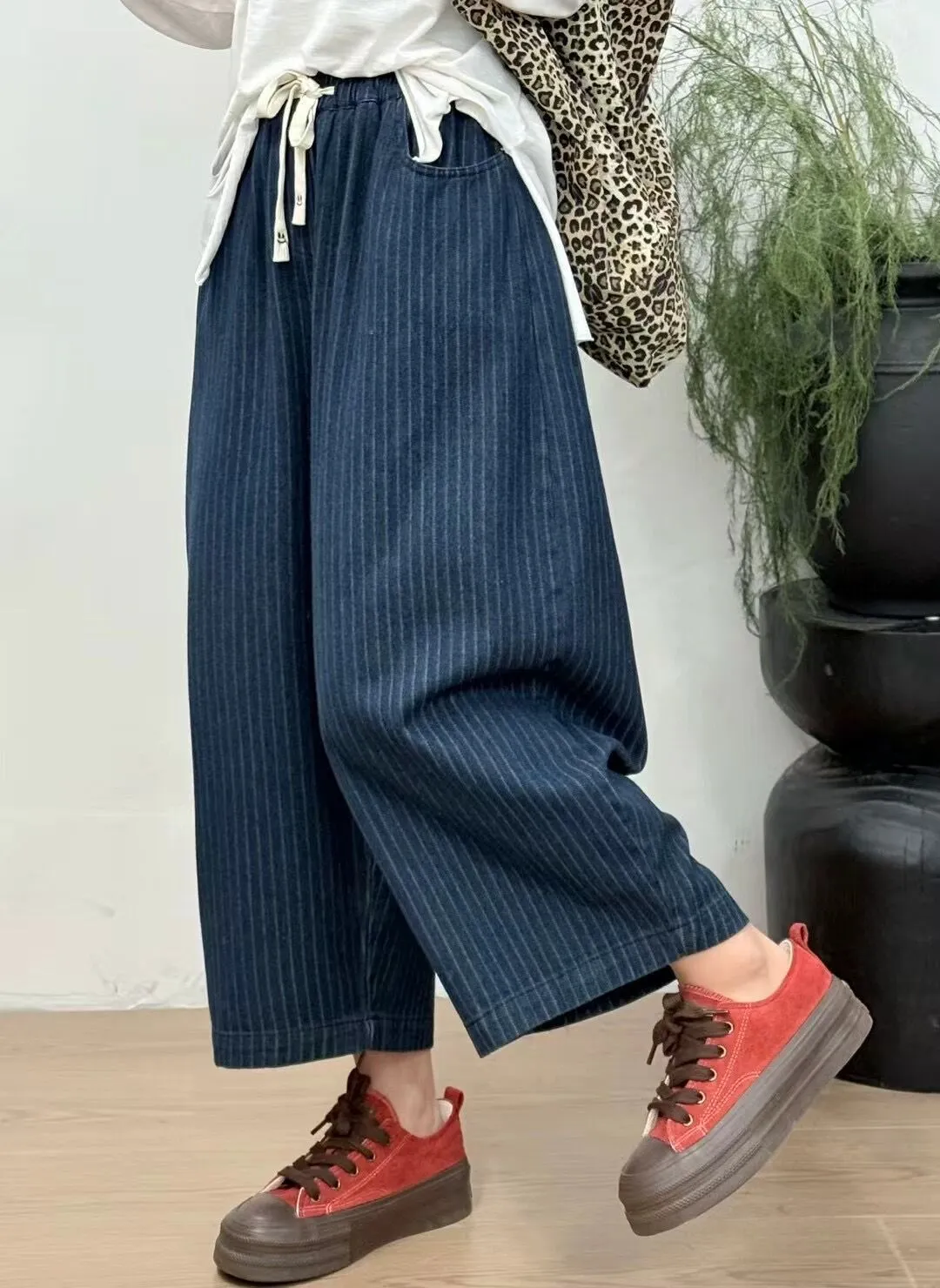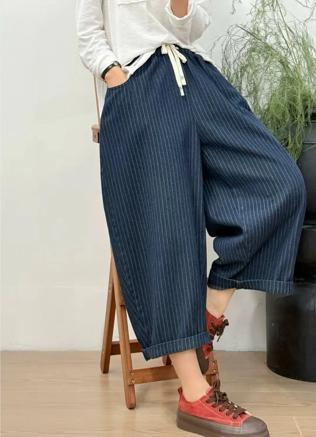 衣都精品- 新款文藝百搭寬鬆大碼條紋鬆緊腰牛仔褲