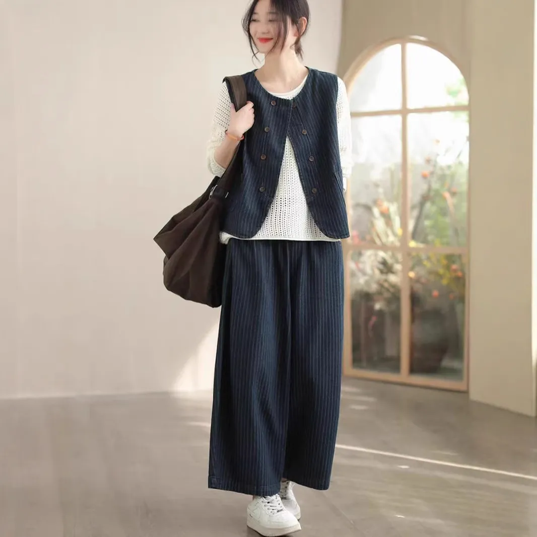 衣都精品- 新款文藝百搭寬鬆大碼條紋鬆緊腰牛仔褲
