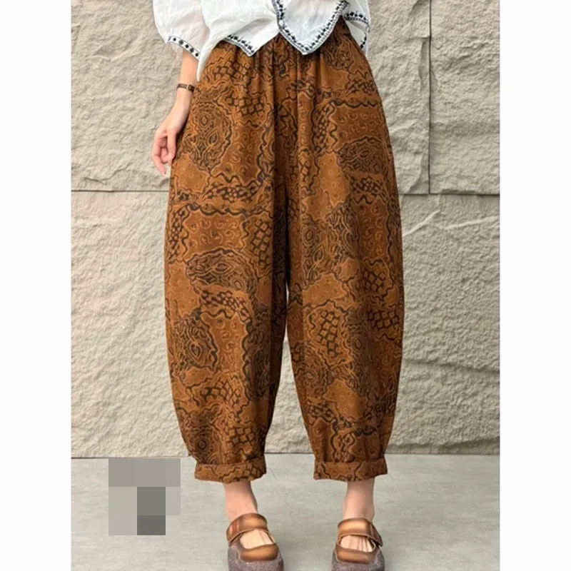 衣都精品- 新款復古印花做舊大碼顯瘦鬆緊腰哈倫褲