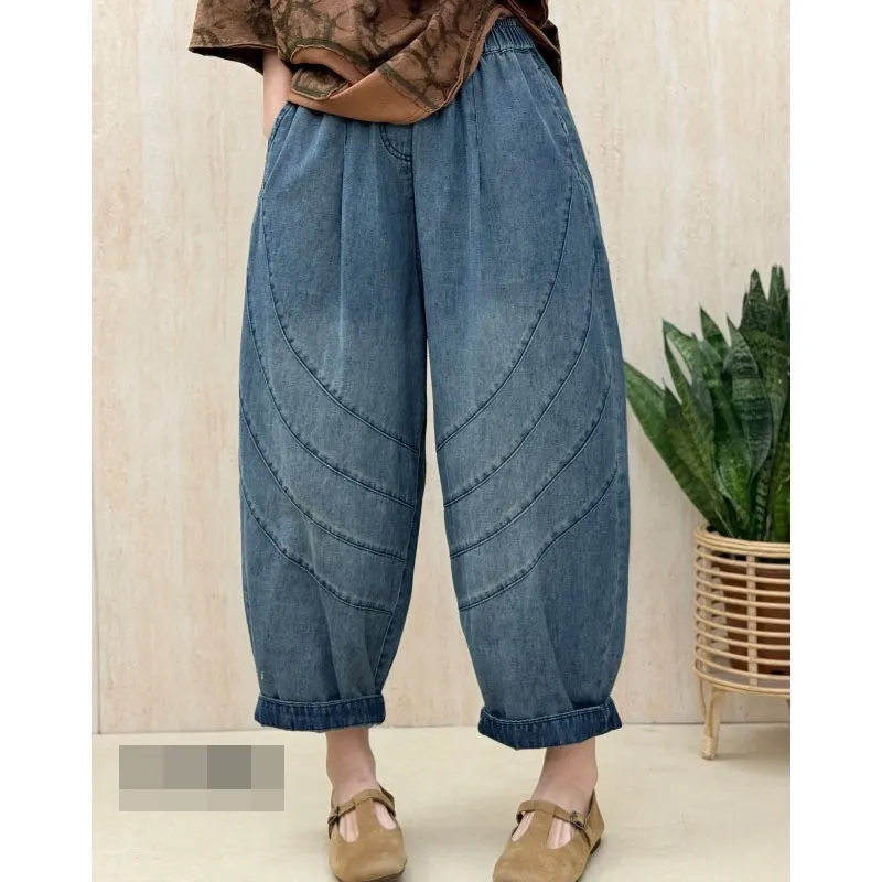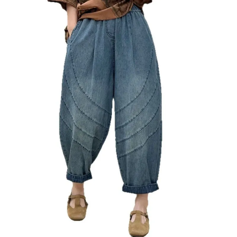 衣都精品- 新款復古水洗磨白鬆緊腰線條拼接牛仔哈倫褲