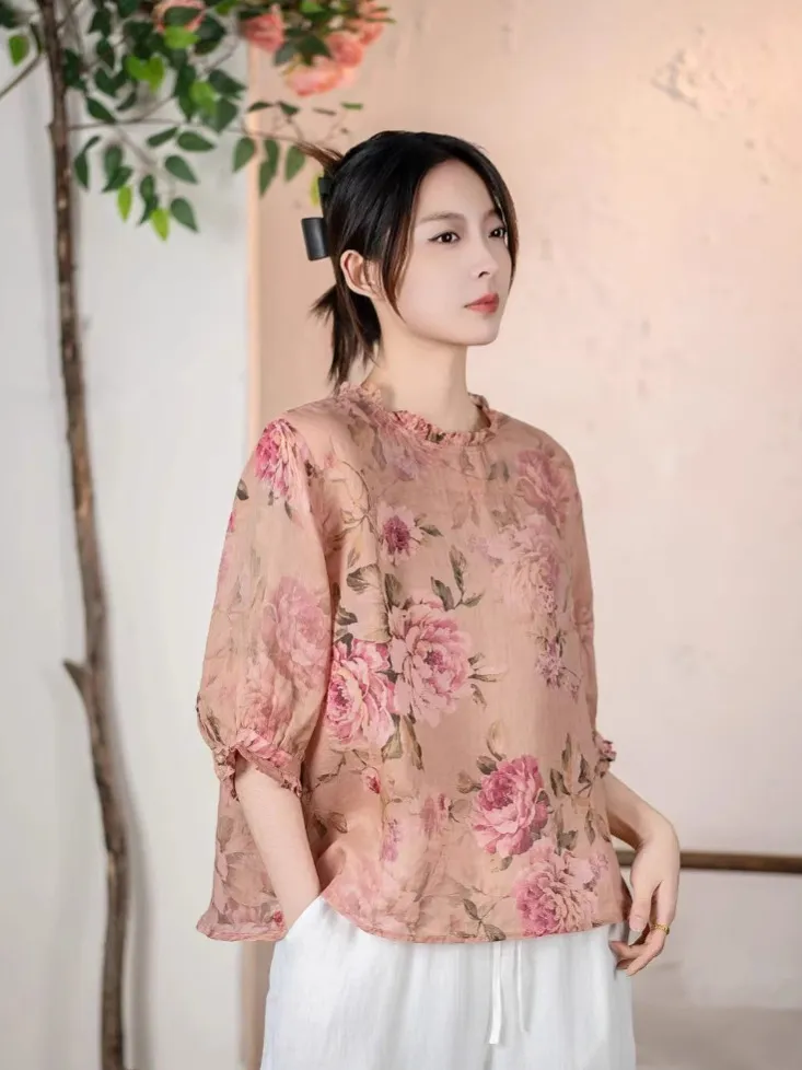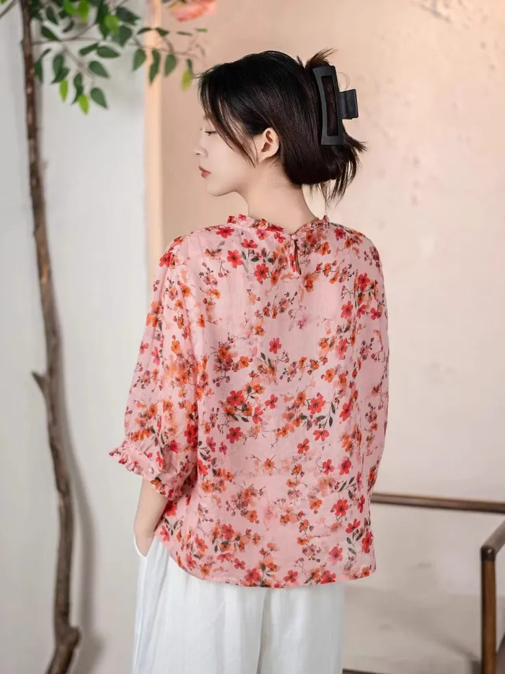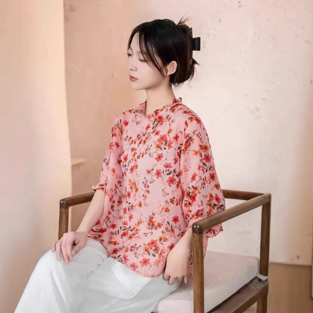 衣都精品- 新款文藝寬鬆型圓領印花斜襟刺繡上衣