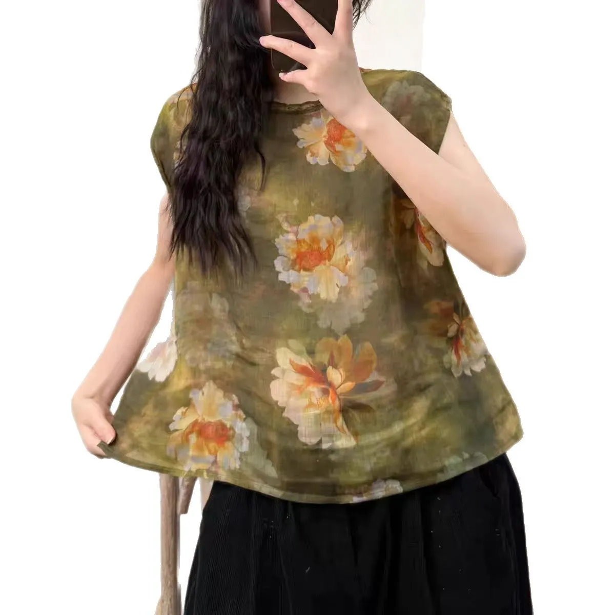 衣都精品- 新款復古氣質數碼印花雙層苧麻半身裙