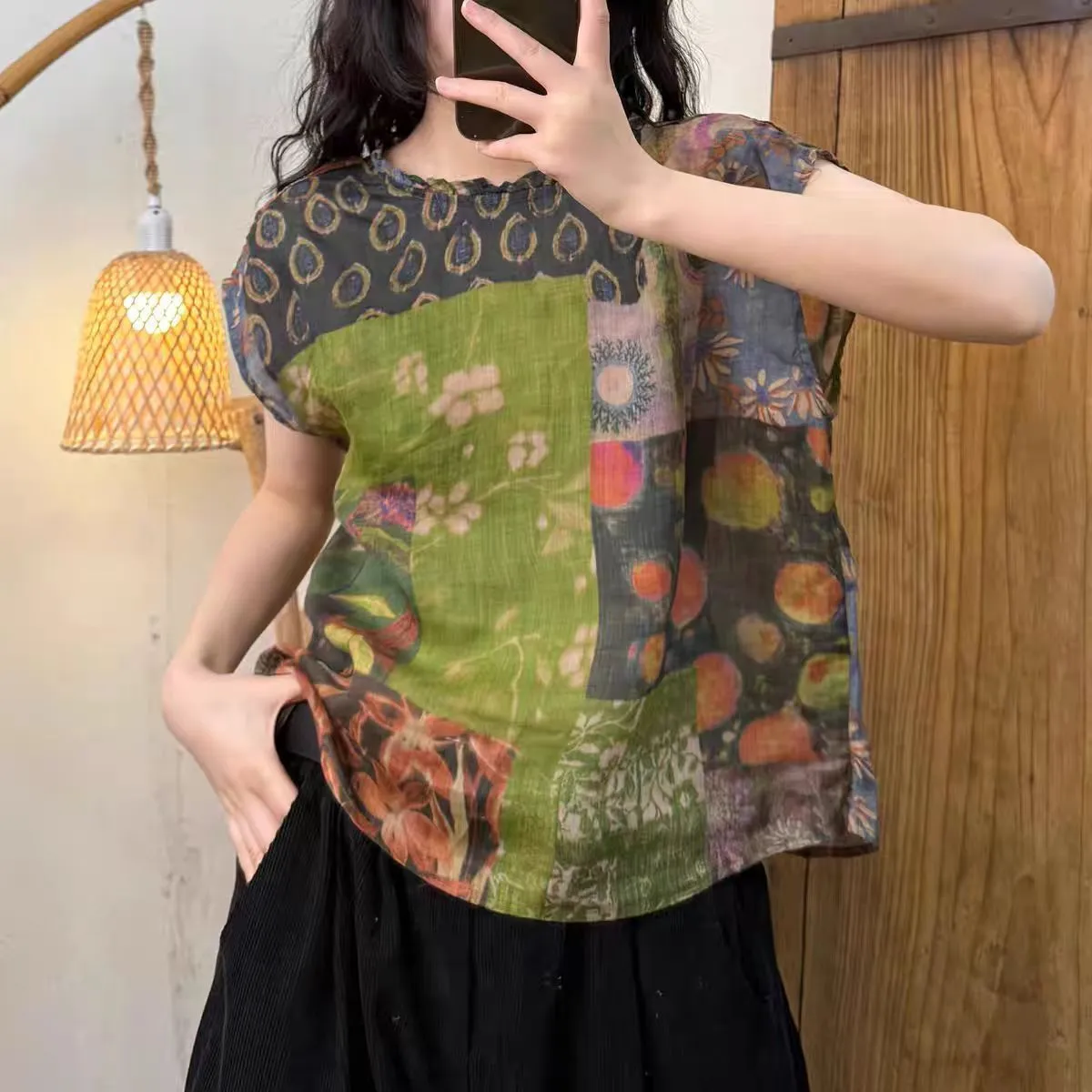 衣都精品- 新款復古圓領套頭文藝風印花上衣
