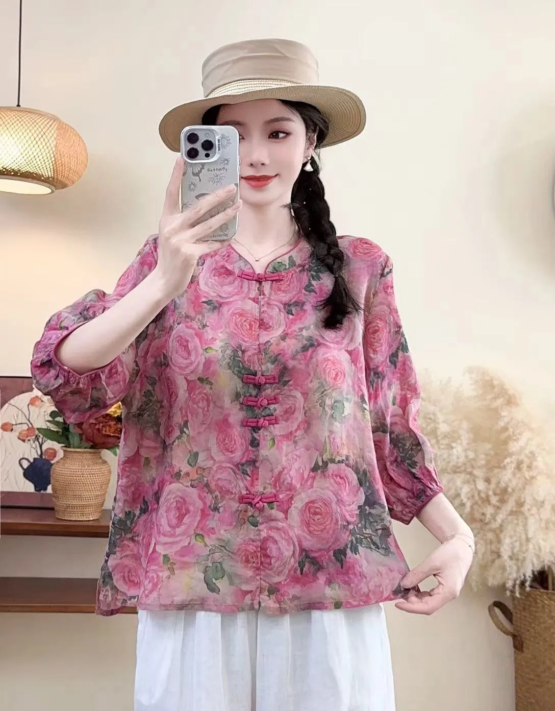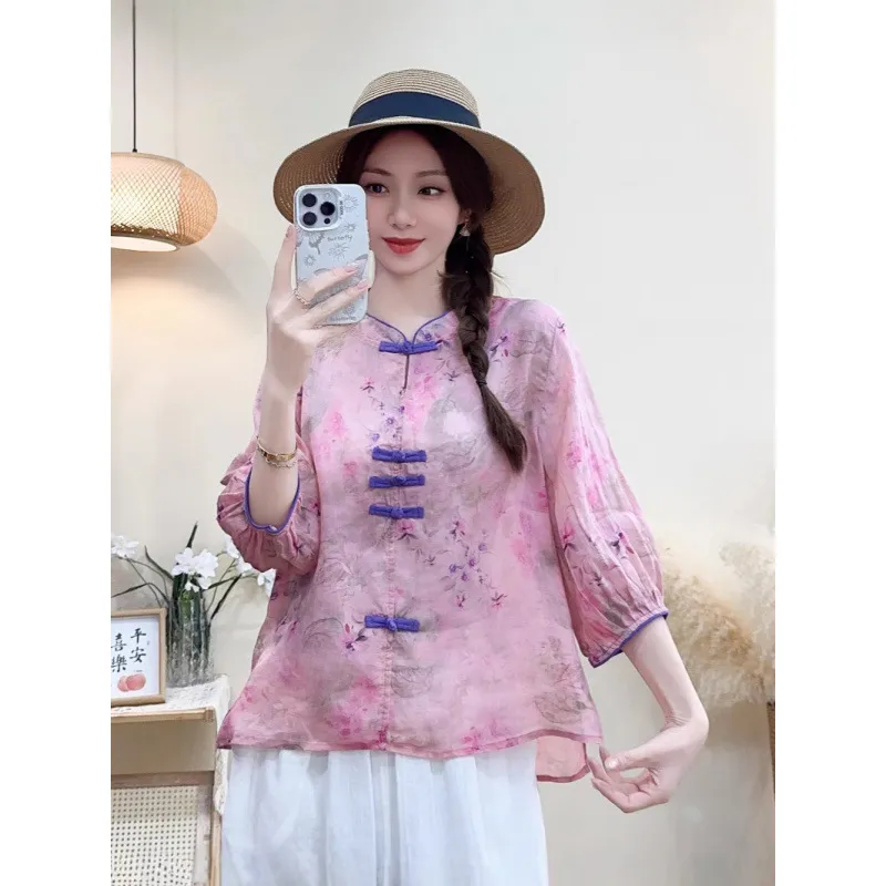 衣都精品- 新款復古休閒寬鬆七分袖半開襟上衣