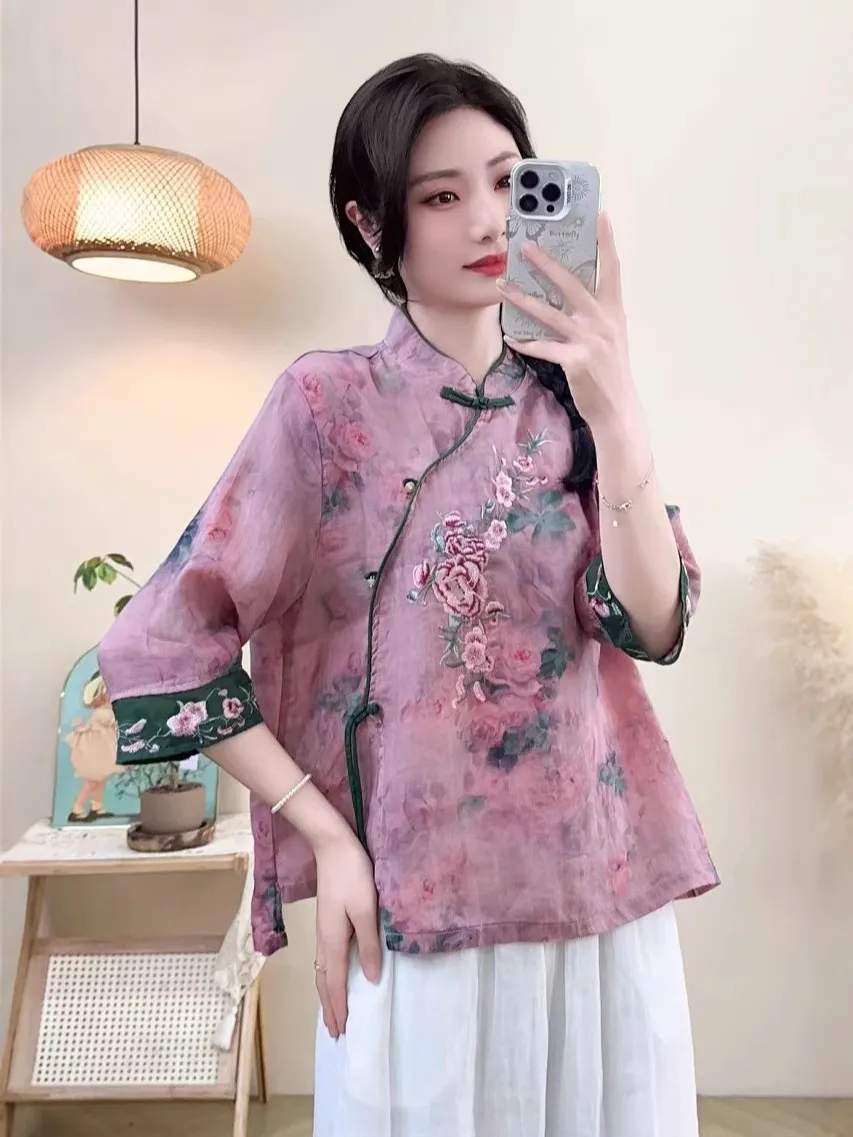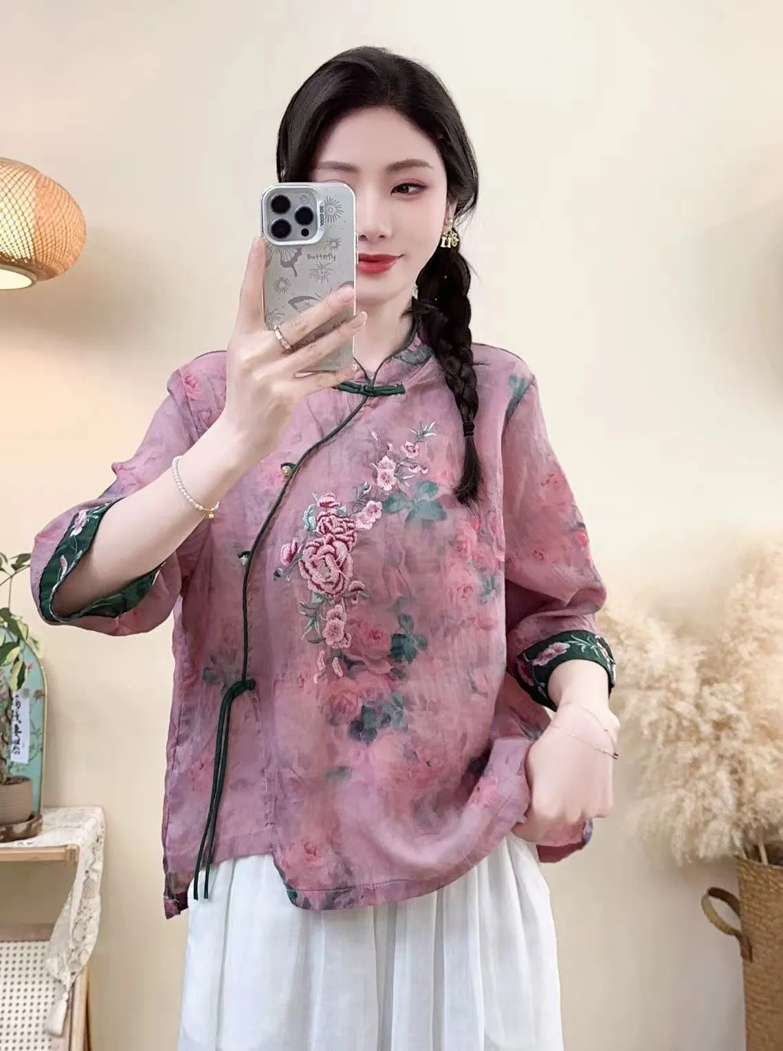 衣都精品- 新款復古休閒寬鬆七分袖半開襟上衣