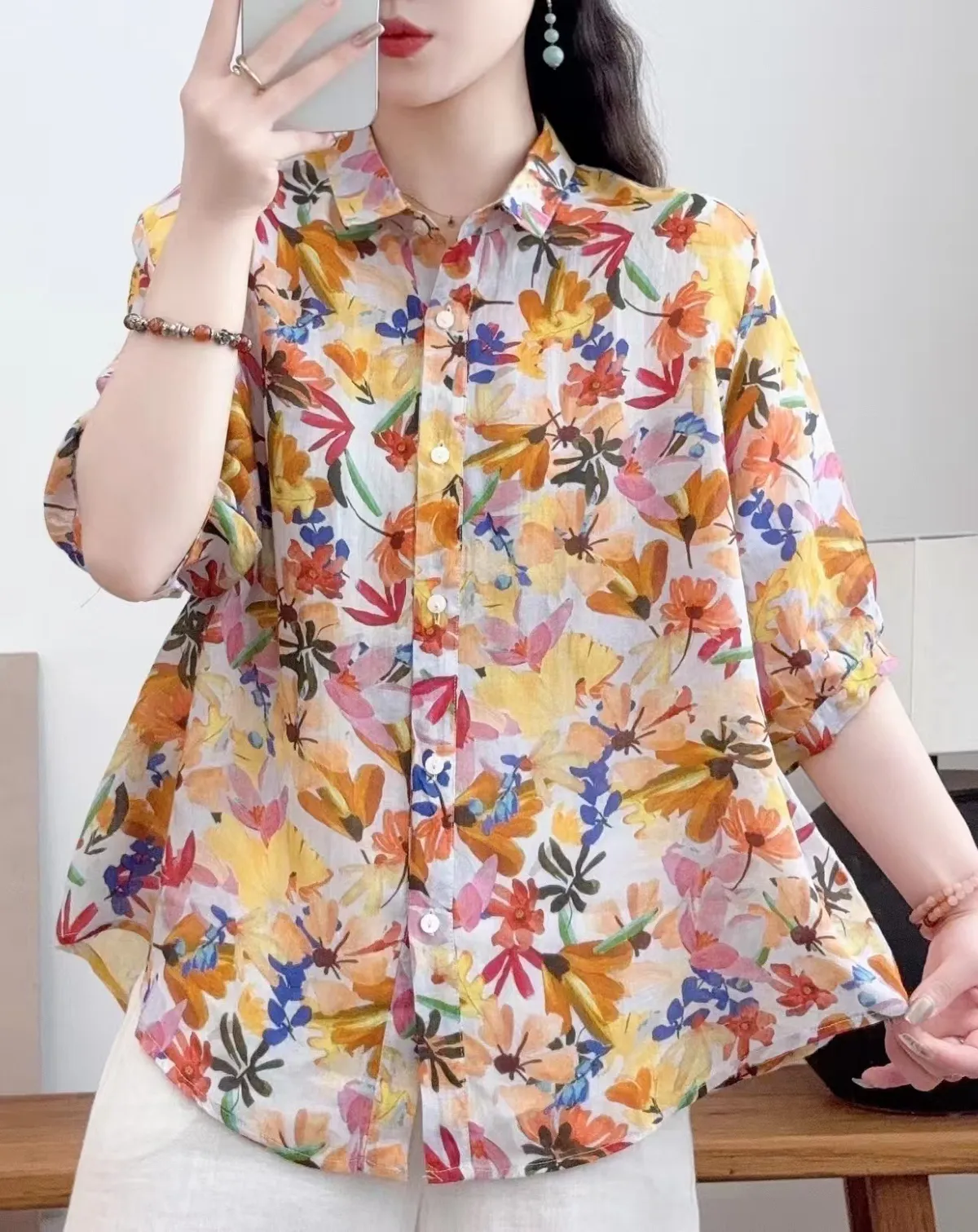 衣都精品- 新款復古休閒寬鬆七分袖半開襟上衣