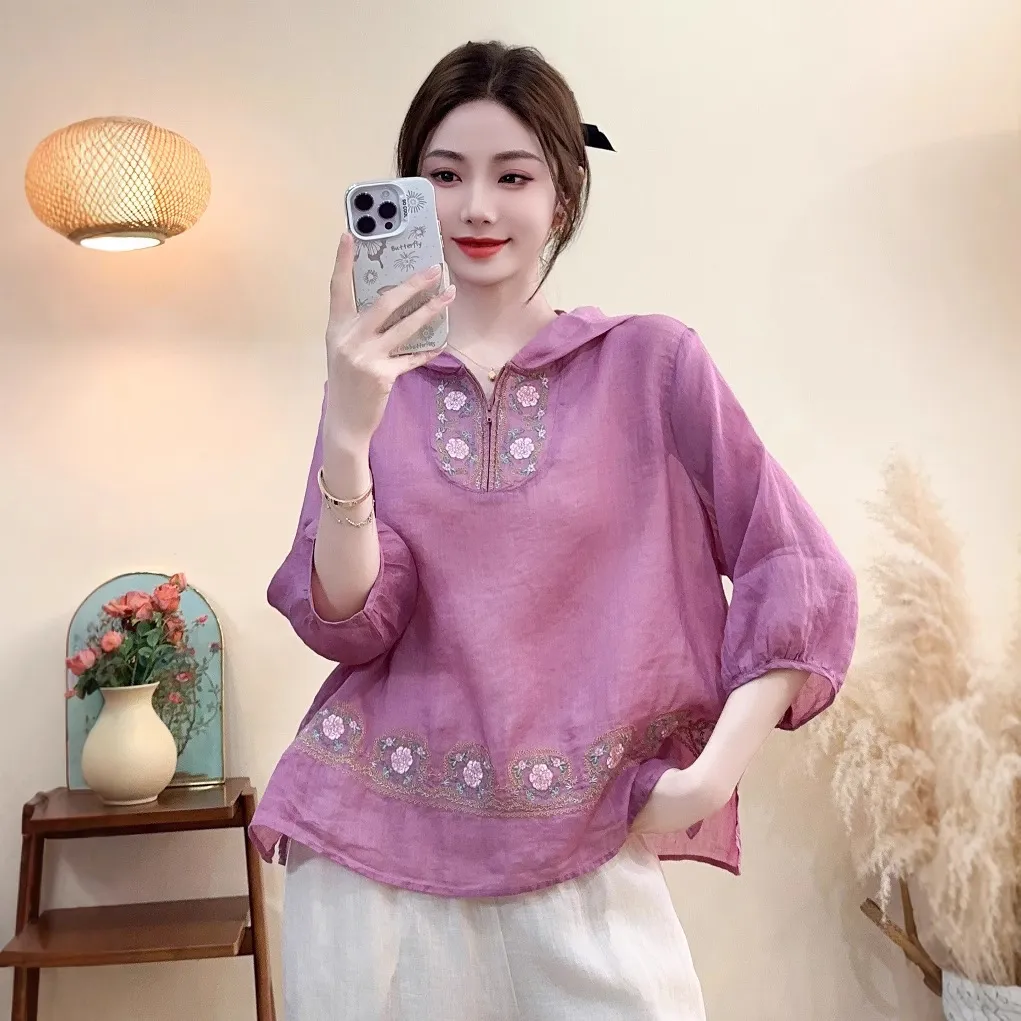衣都精品- 新款文藝風刺繡苧麻七分袖盤扣上衣