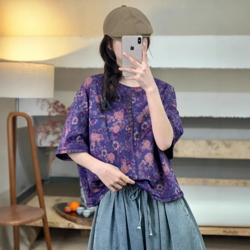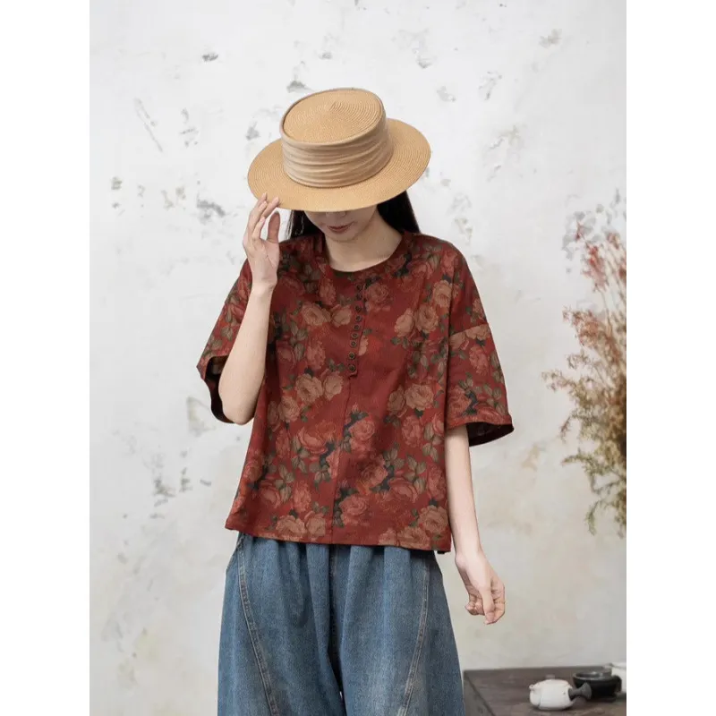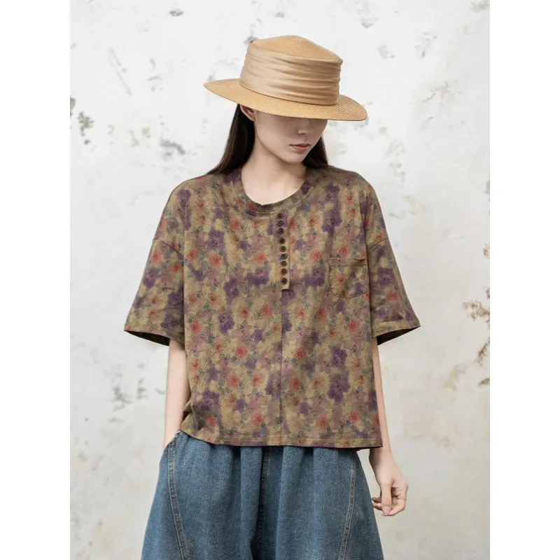 衣都精品- 新款復古花卉印花圓領套頭五分袖上衣
