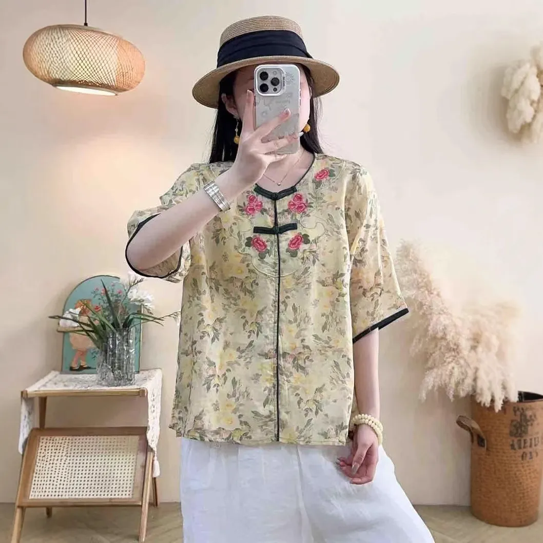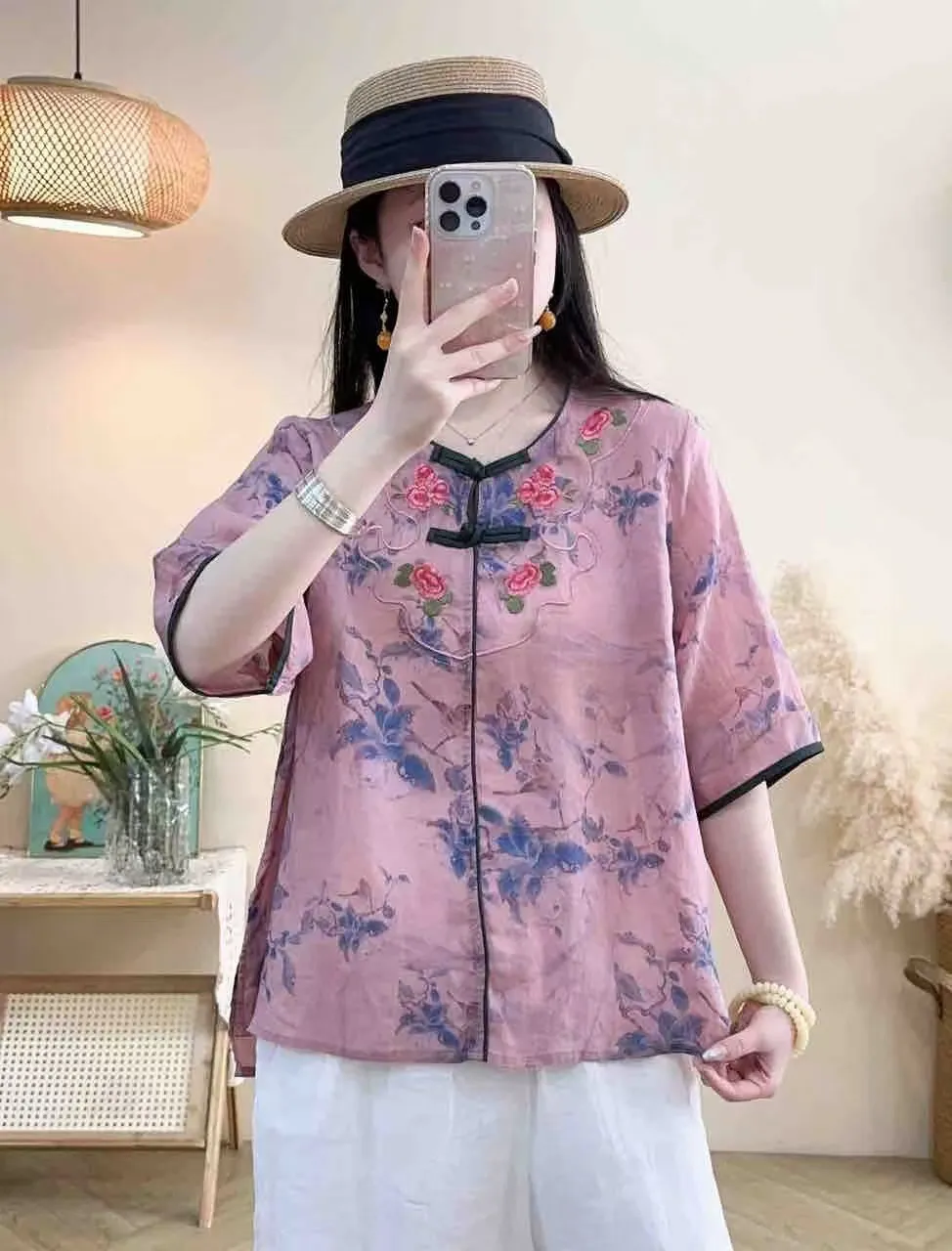 衣都精品- 新款文藝風刺繡苧麻七分袖盤扣上衣