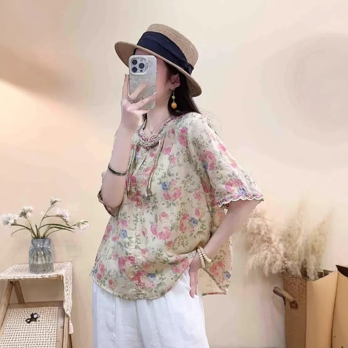 衣都精品- 新款文藝風刺繡苧麻七分袖盤扣上衣