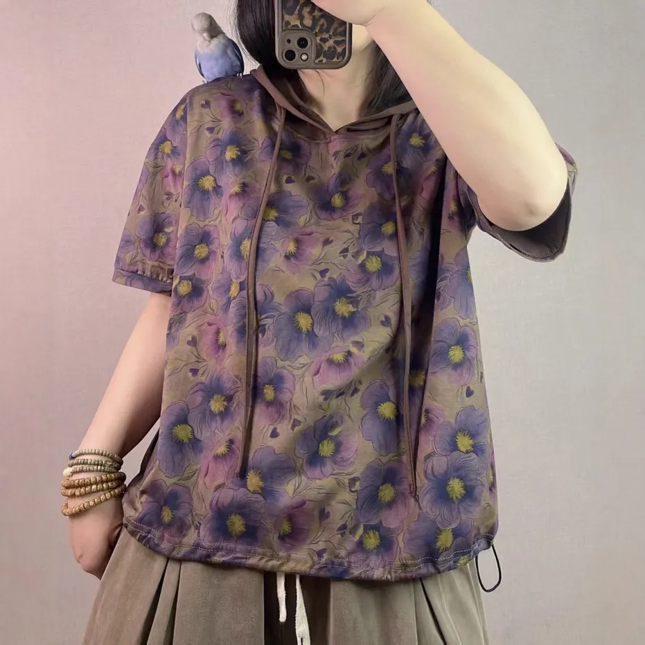 衣都精品- 新款文藝休閒印花連帽套頭上衣